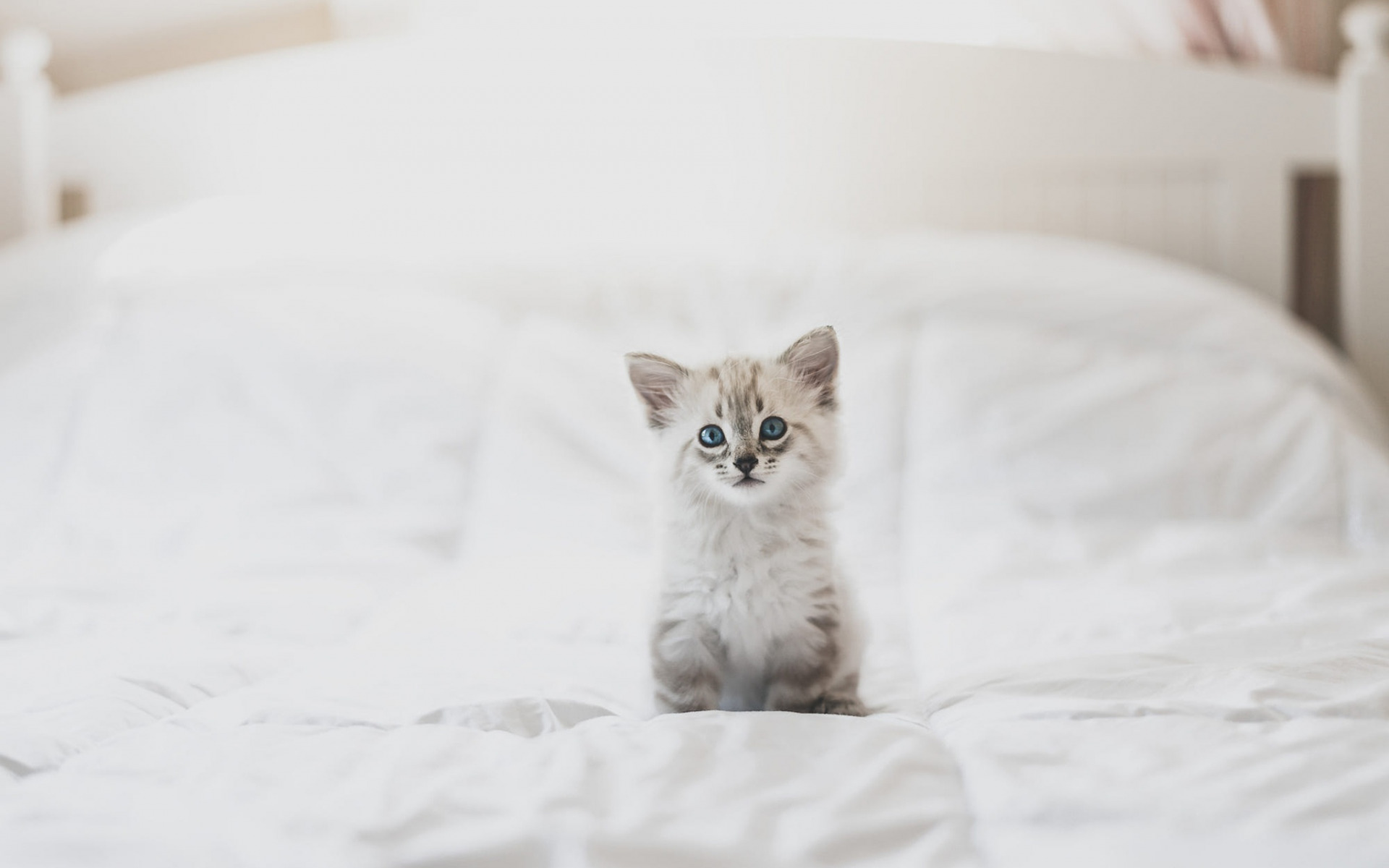 Description: A small kitten sitting on top of a white bed in a bedroom with white sheets and pillows on it.