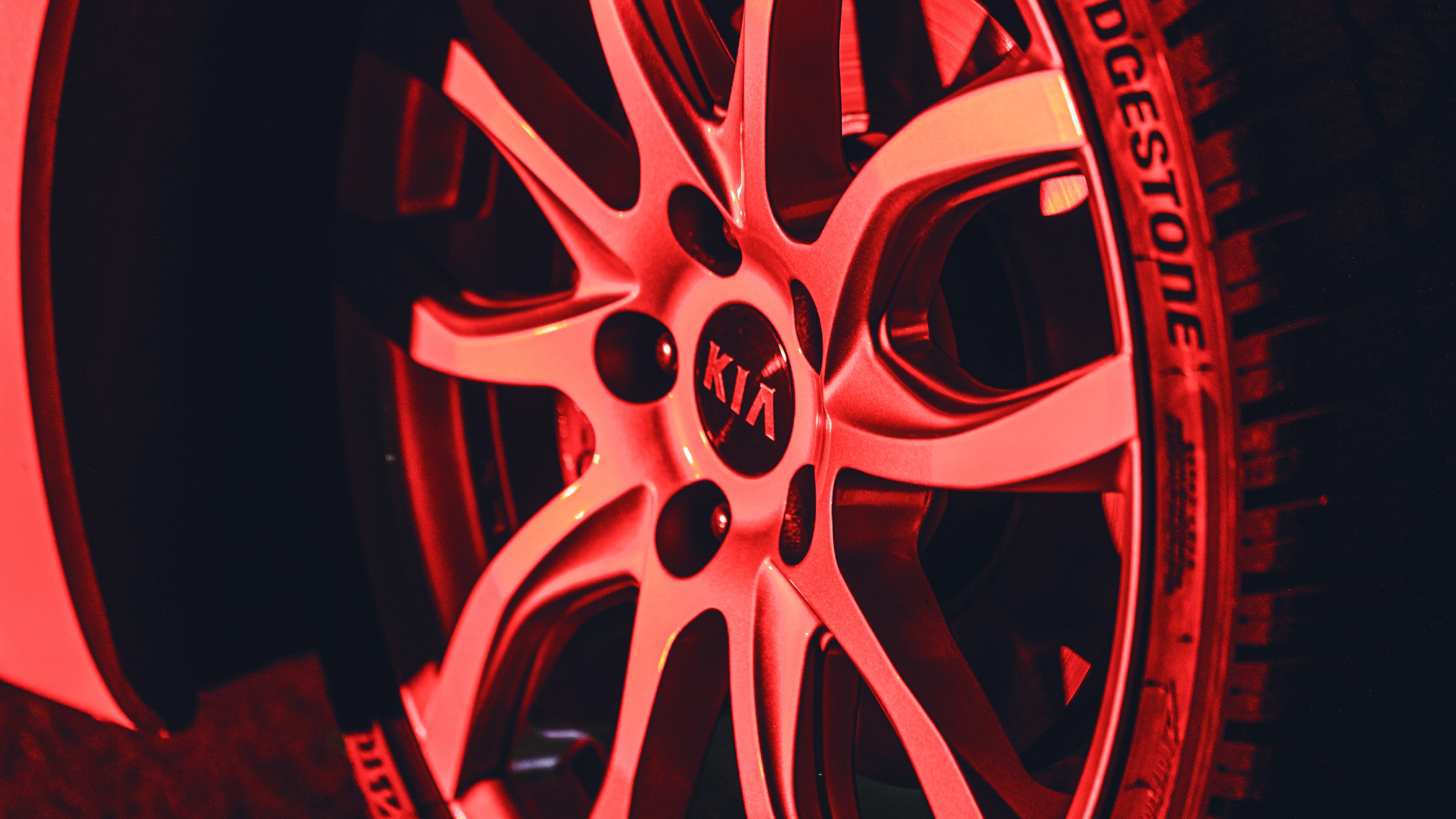 Description: A close up of a tire on a car tire with red light coming from it's center wheel.