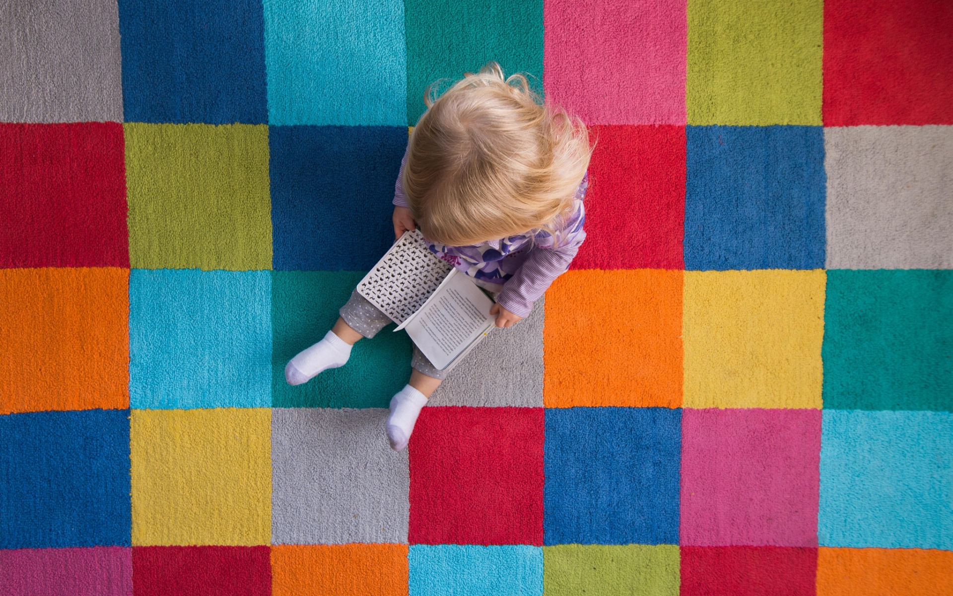 Description: A toddler is laying on a colorful rug with a book in her hand and a book in her other hand.