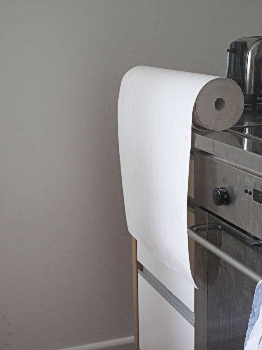 Description: A roll of toilet paper is hanging on a rack next to a stove and a roll of toilet paper.