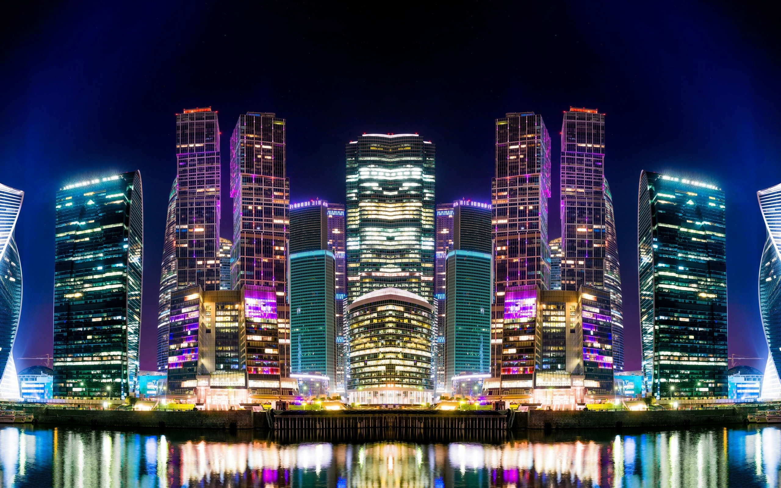 Description: A city skyline with a river and a bridge at night with lights reflecting in the water and a bridge in the foreground.