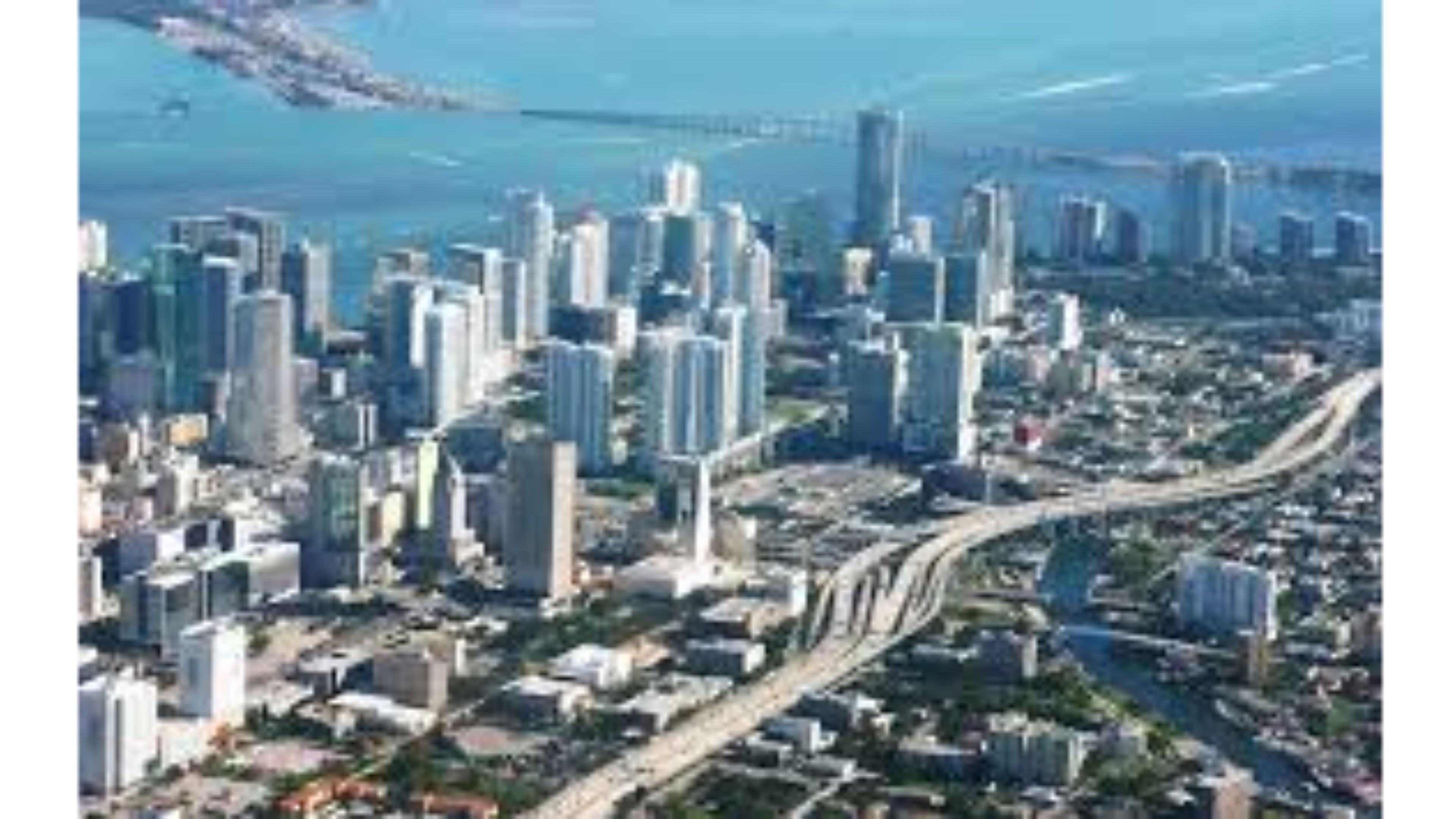 Description: A city with a lot of tall buildings and a highway going through it with a bridge in the middle.