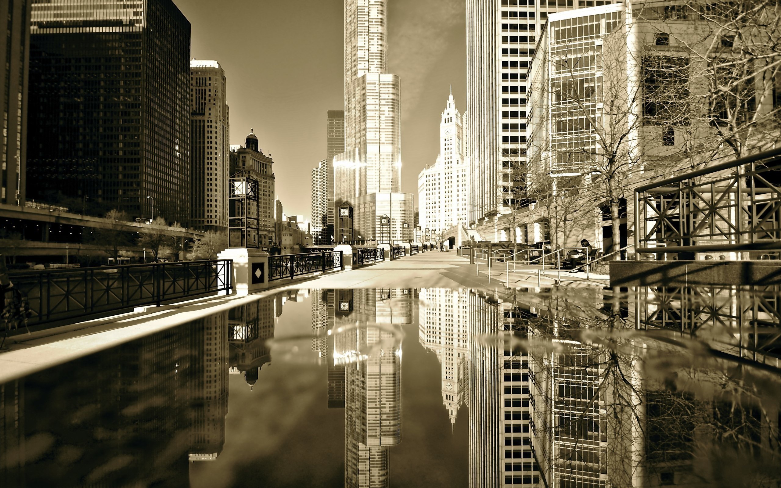 Description: A city with tall buildings and a body of water in the foreground with a bridge in the foreground.