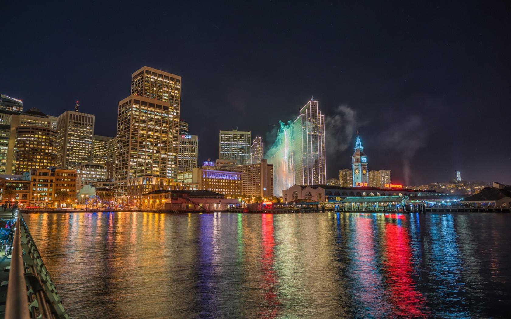 Description: A city skyline with a river and fireworks in the sky at night time with a bridge and lights reflecting off the water.