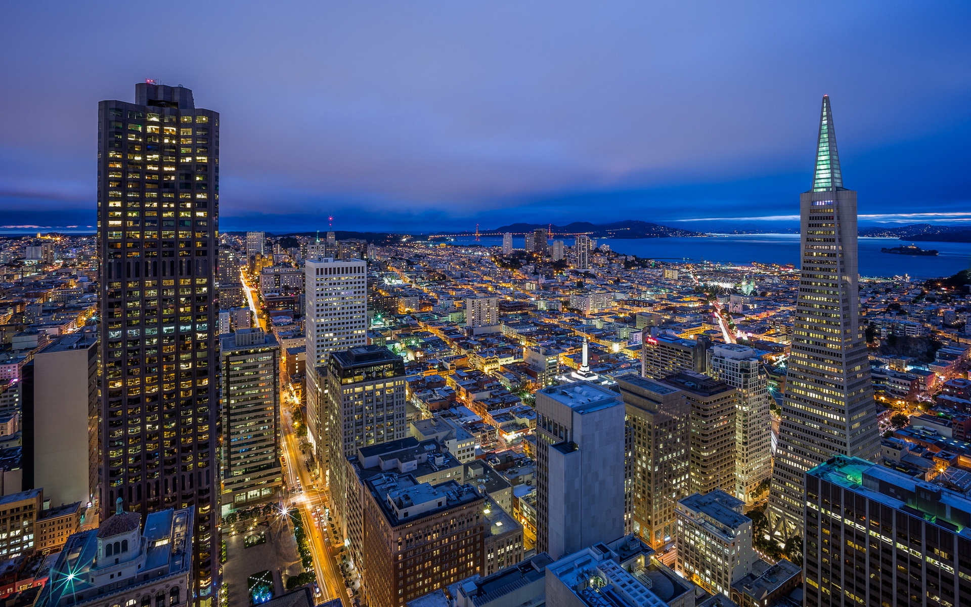 Description: A cityscape with a lot of tall buildings and lights at night time with a blue sky in the background.