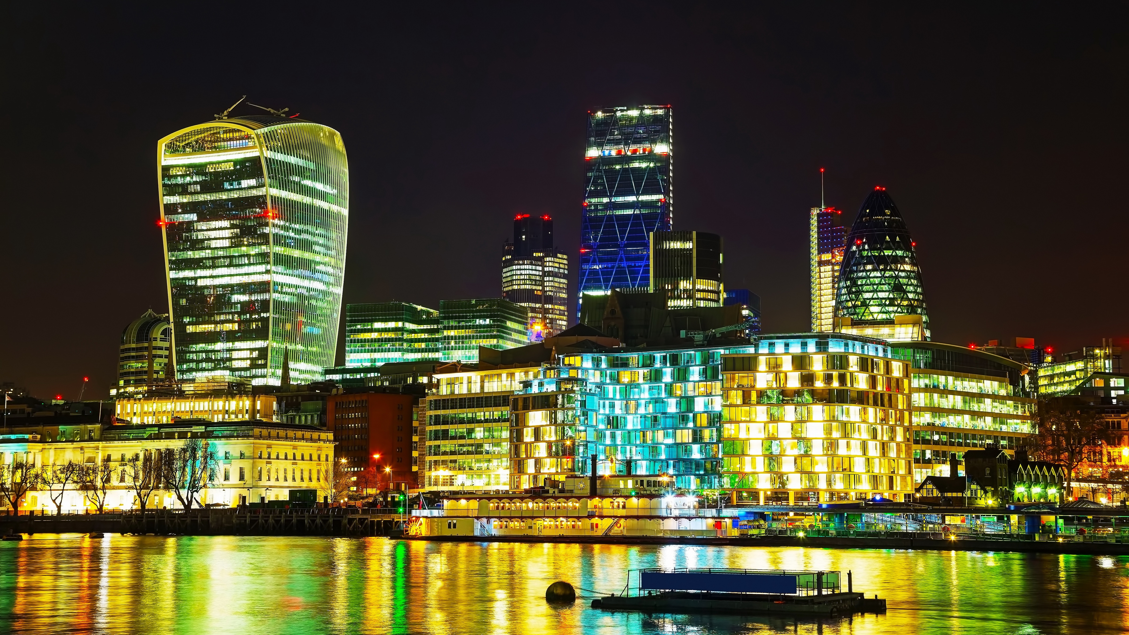 Description: A city skyline with a boat in the water at night time with lights on the buildings and a boat in the water.
