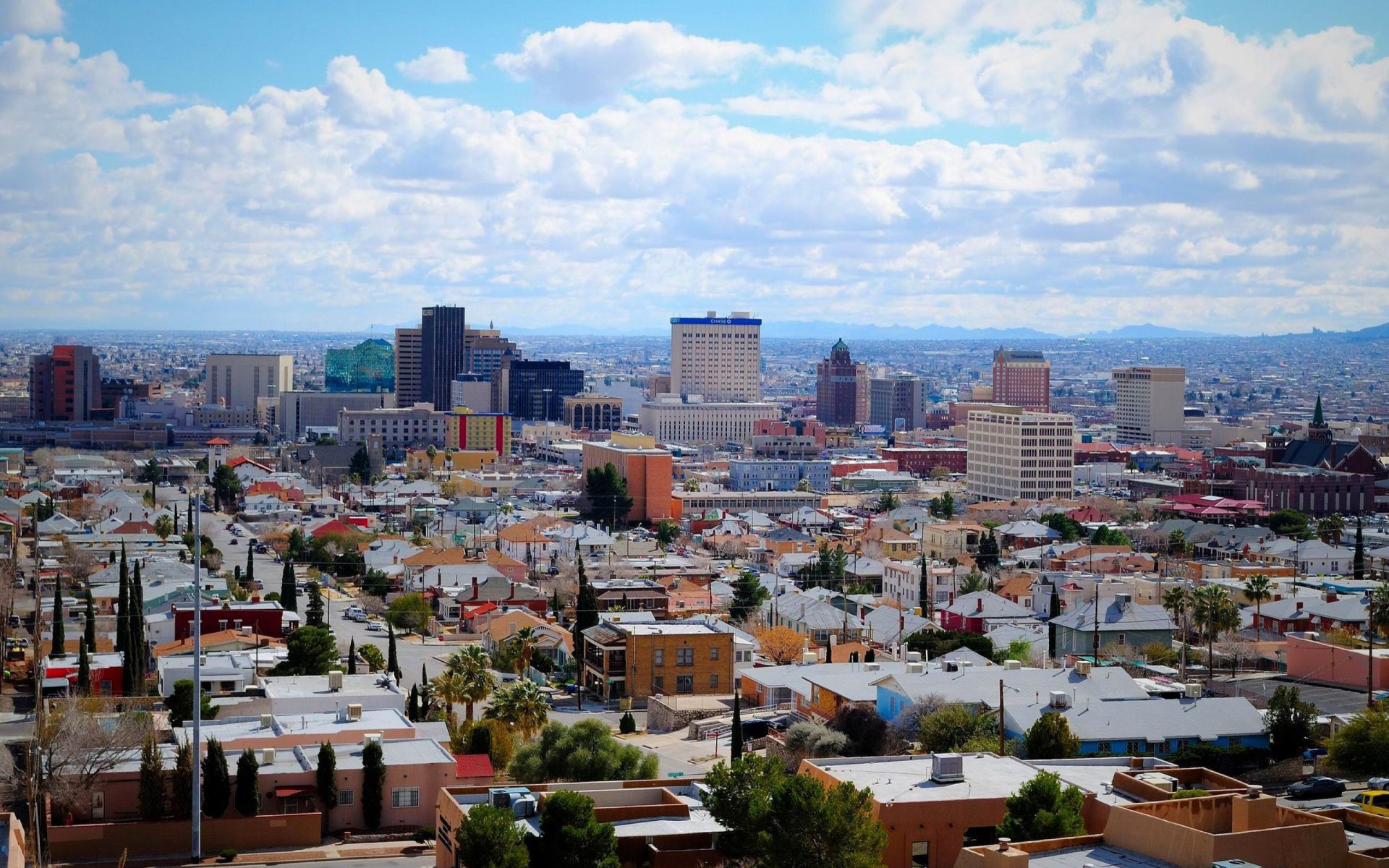 Description: A city with a lot of tall buildings and a sky line in the background with clouds in the sky.