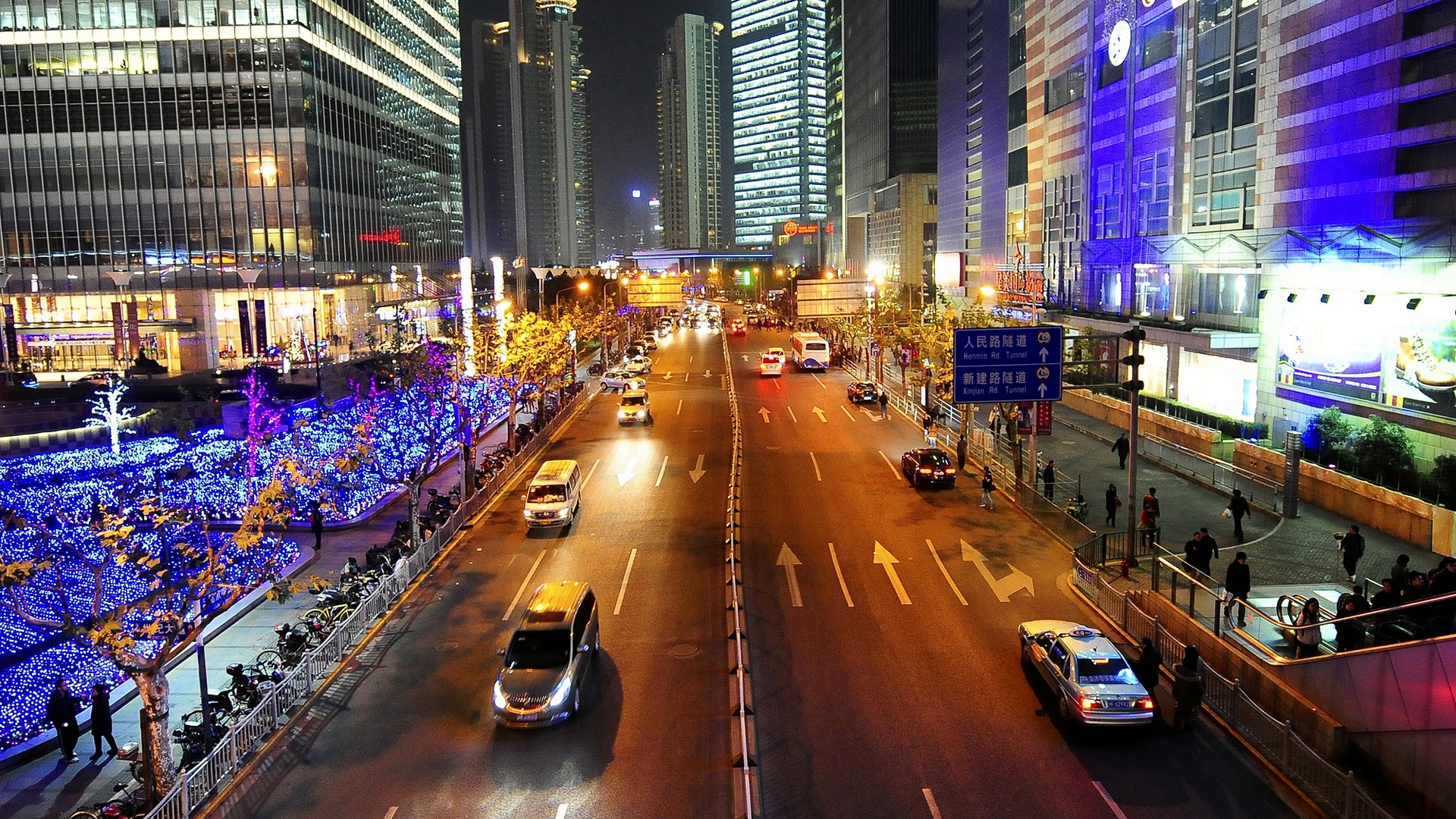 Description: A city street with cars and people walking on the sidewalk at night time with lights on the buildings and trees.