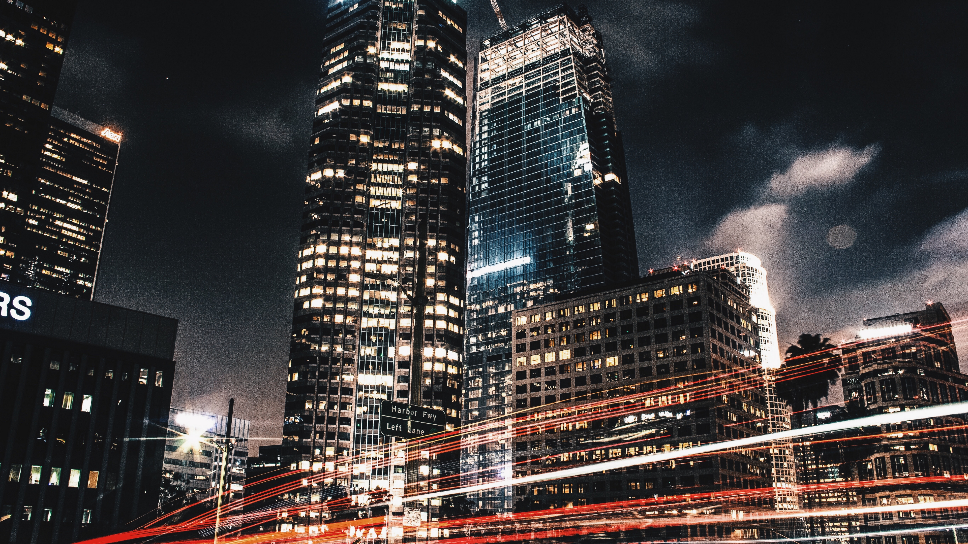 Description: A city at night with a lot of lights and buildings in the background with a sky line in the foreground.