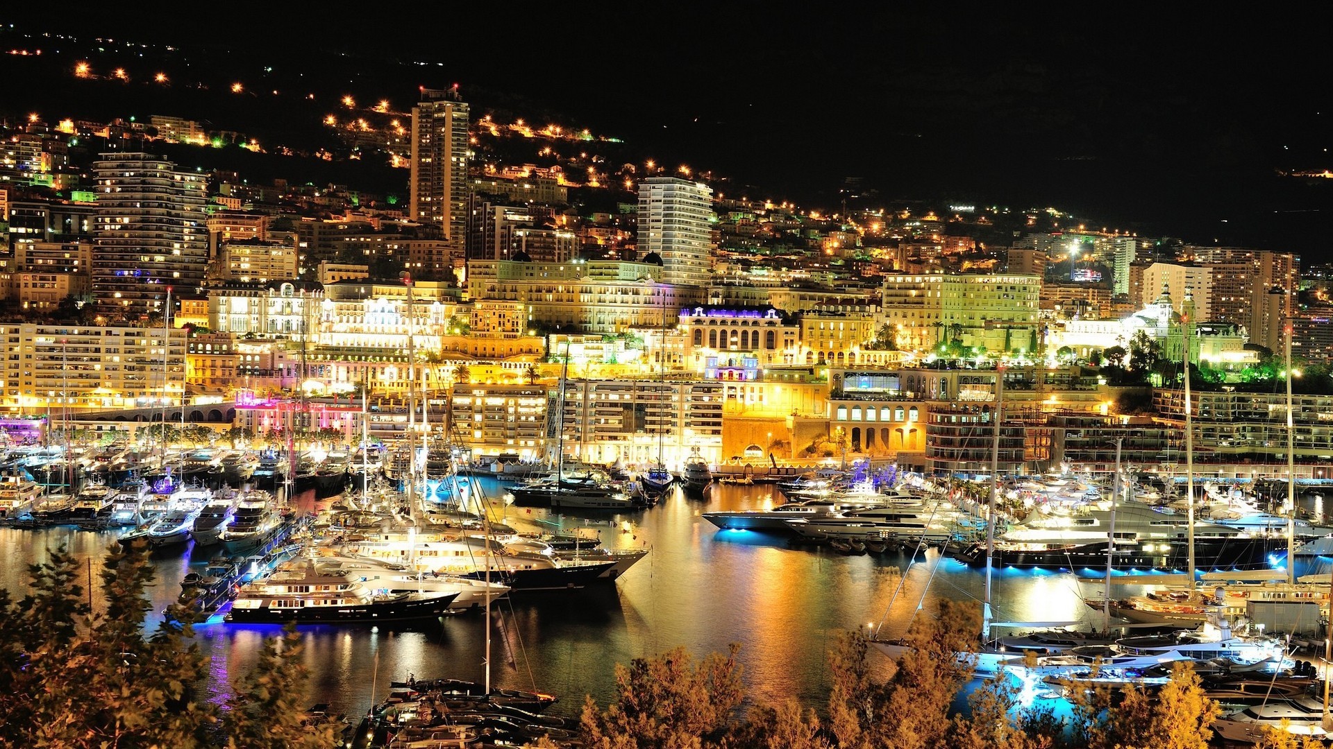 Description: A city at night with boats docked in the harbor and lights on the buildings and trees in the foreground.