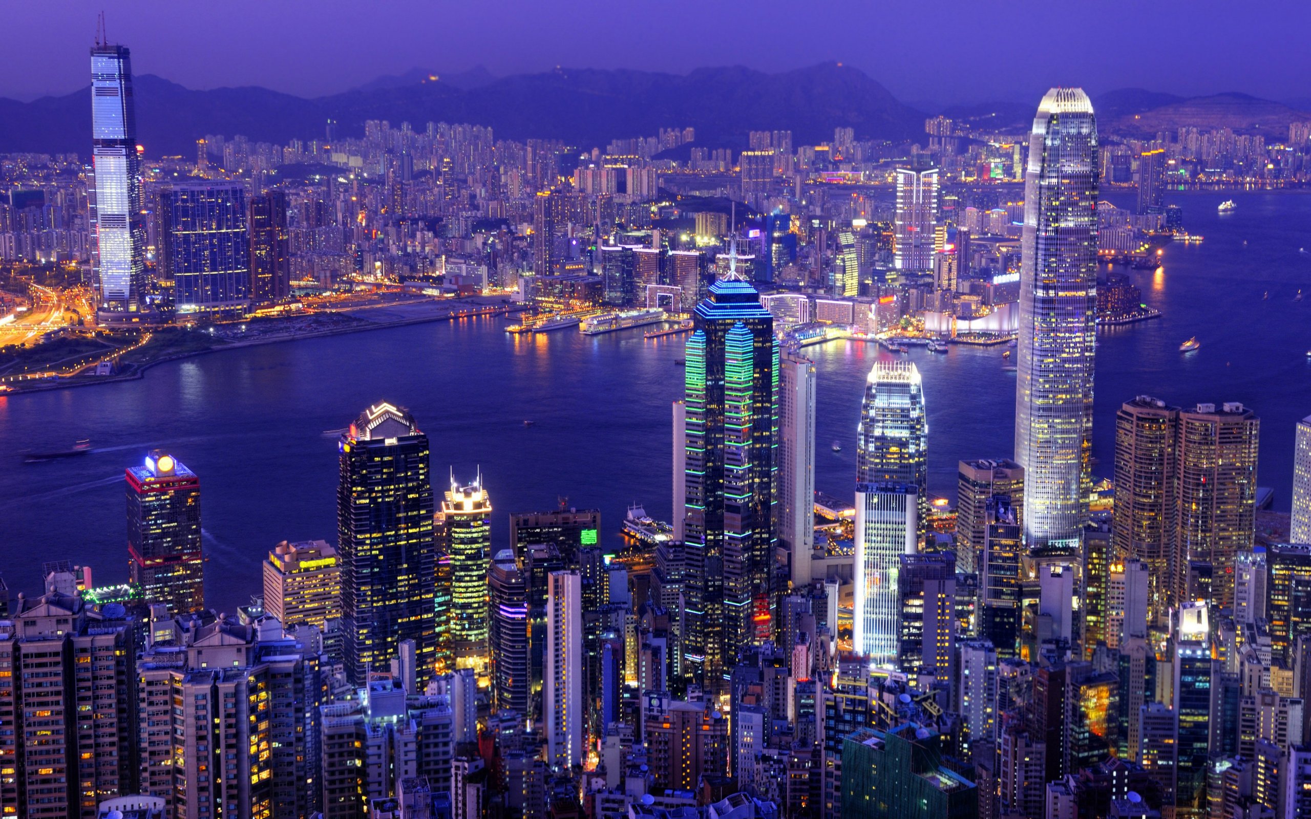 Description: A city skyline at night with a lot of lights on it and a body of water in the foreground.