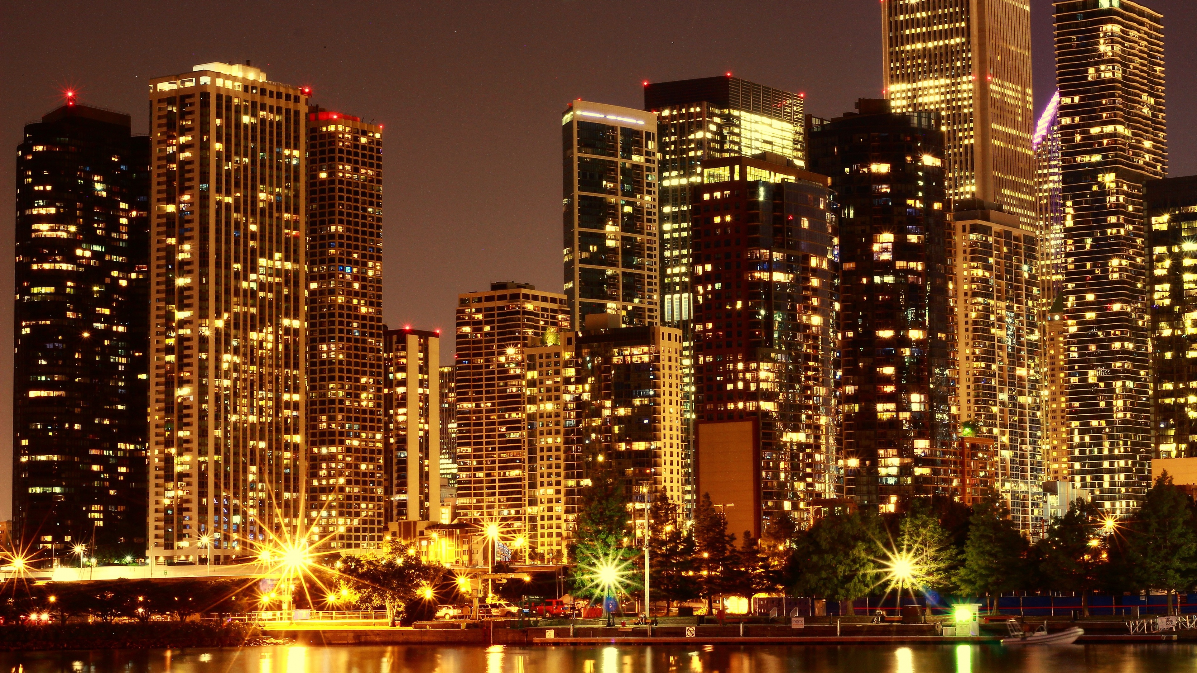 Description: A city skyline at night with lights reflecting in the water and a boat in the foreground with a bridge in the foreground.