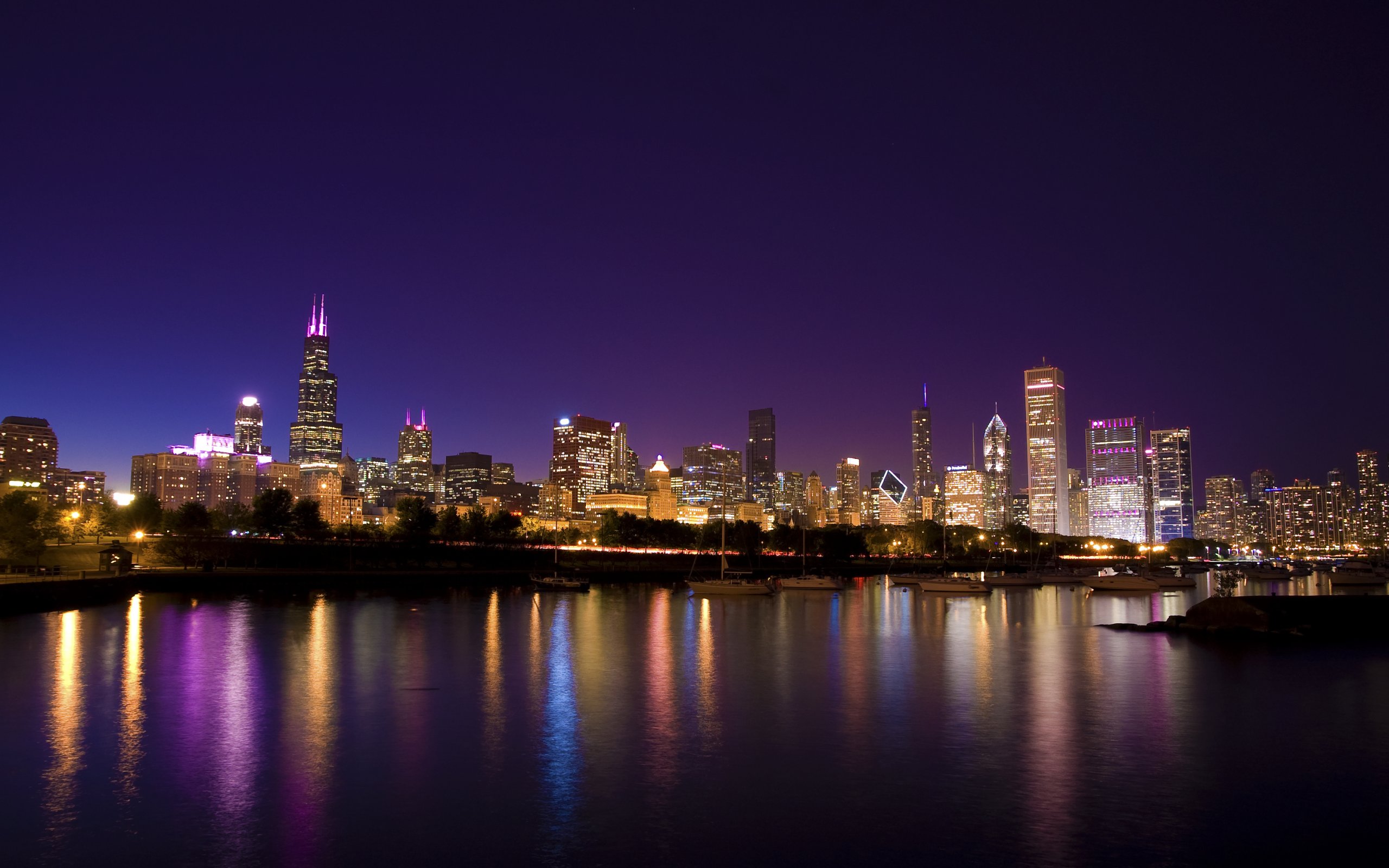 Description: A city skyline at night with a lake in front of it and a boat in the water in front of it.