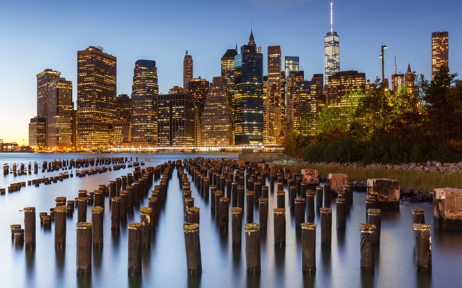 Description: A city skyline with a large body of water in front of it and a row of wooden posts in the foreground.