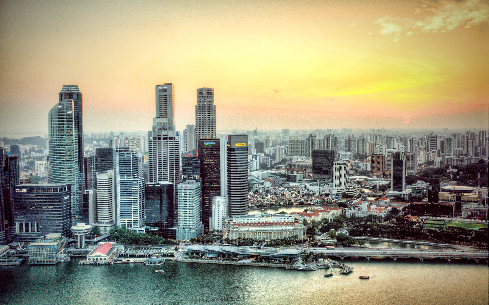 Description: A city skyline with a body of water in front of it and a sunset in the background with a few clouds.