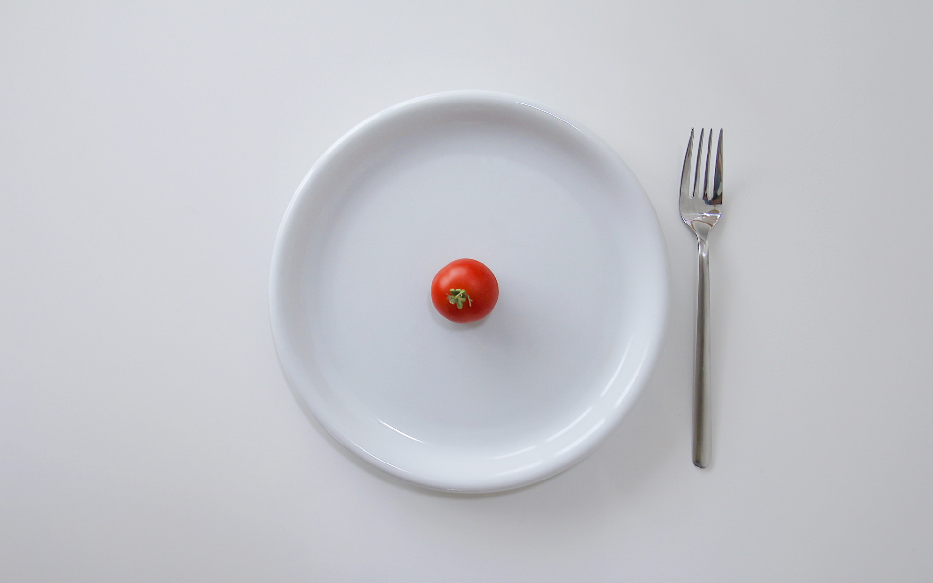 Description: A tomato on a plate with a fork and knife on a table top with a white background.