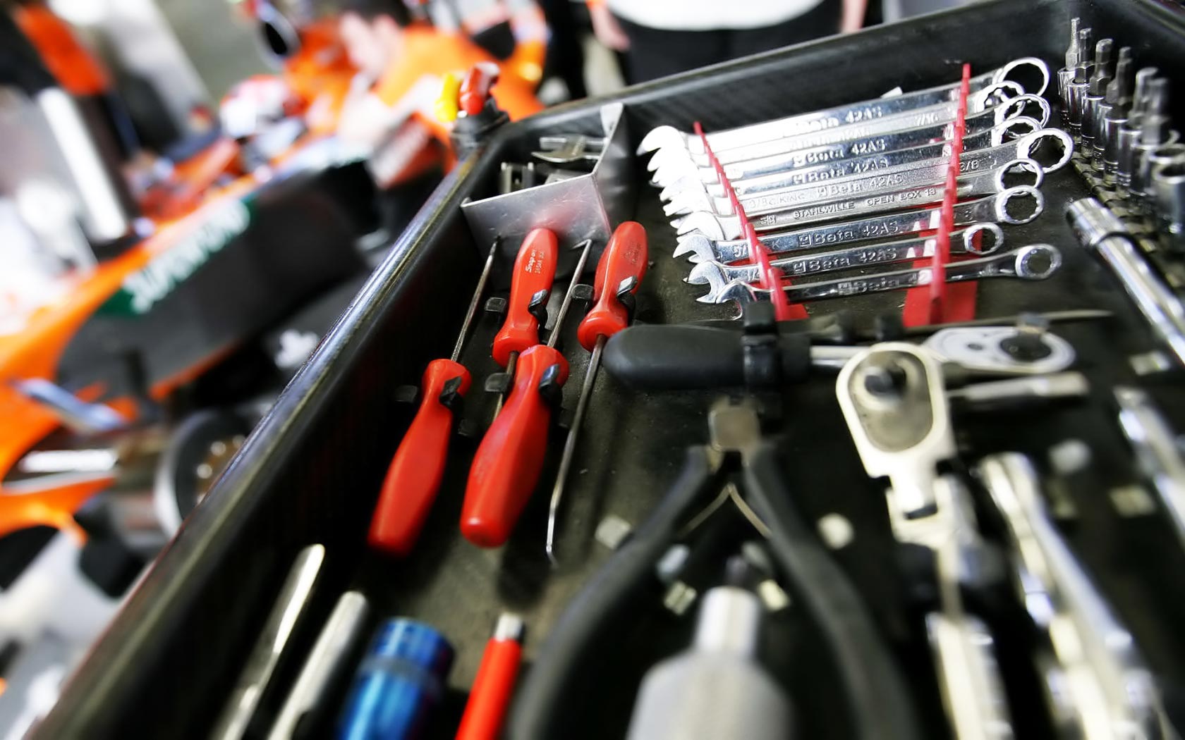 Description: A toolbox filled with tools and tools for repair and maintenance on a table in a shop or workshop.