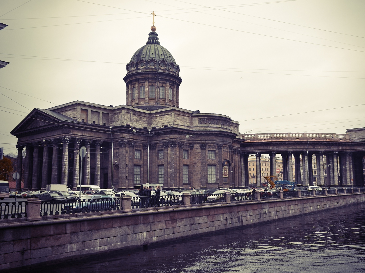 Description: A large building with a tower and a clock on top of it next to a river and a bridge.