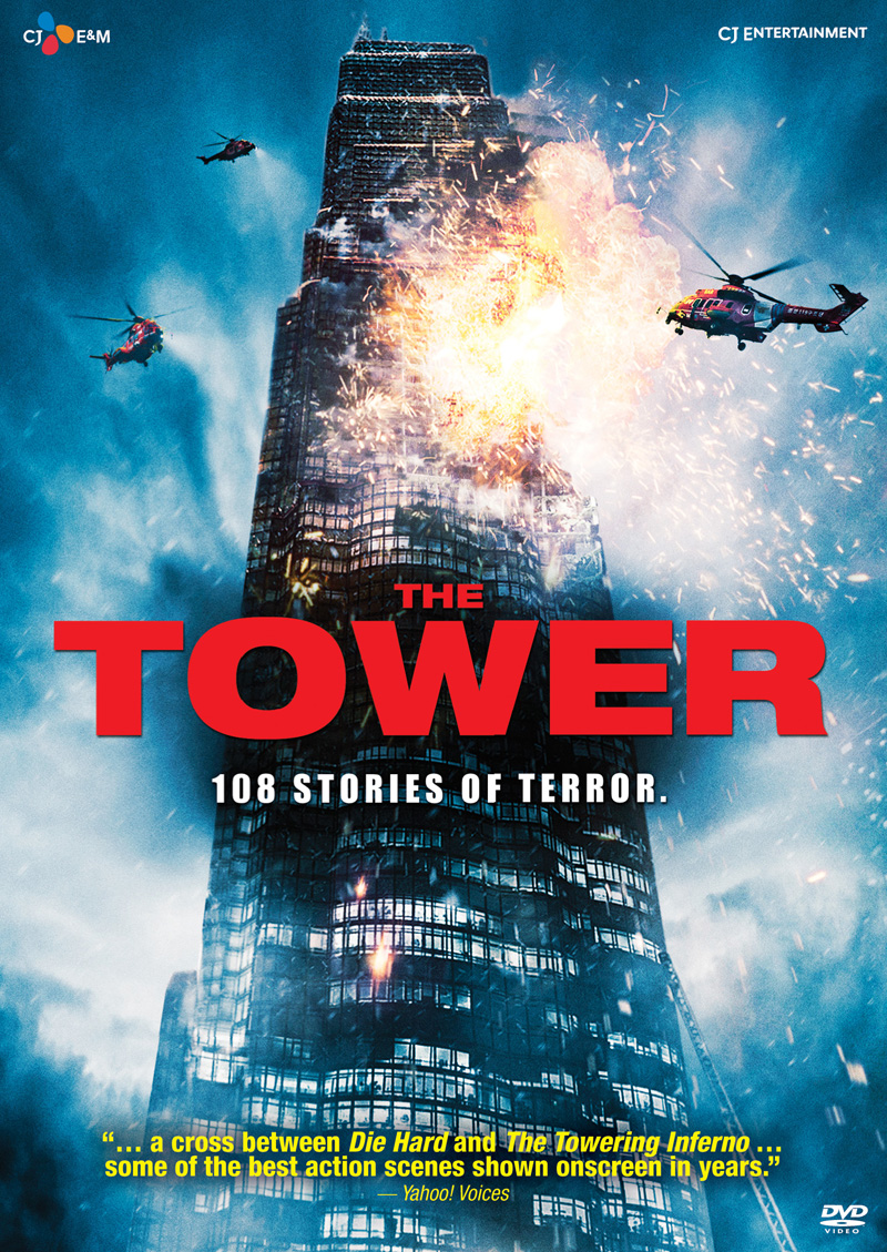 Description: A movie poster for the tower with a firework tower in the background and a helicopter flying over it.
