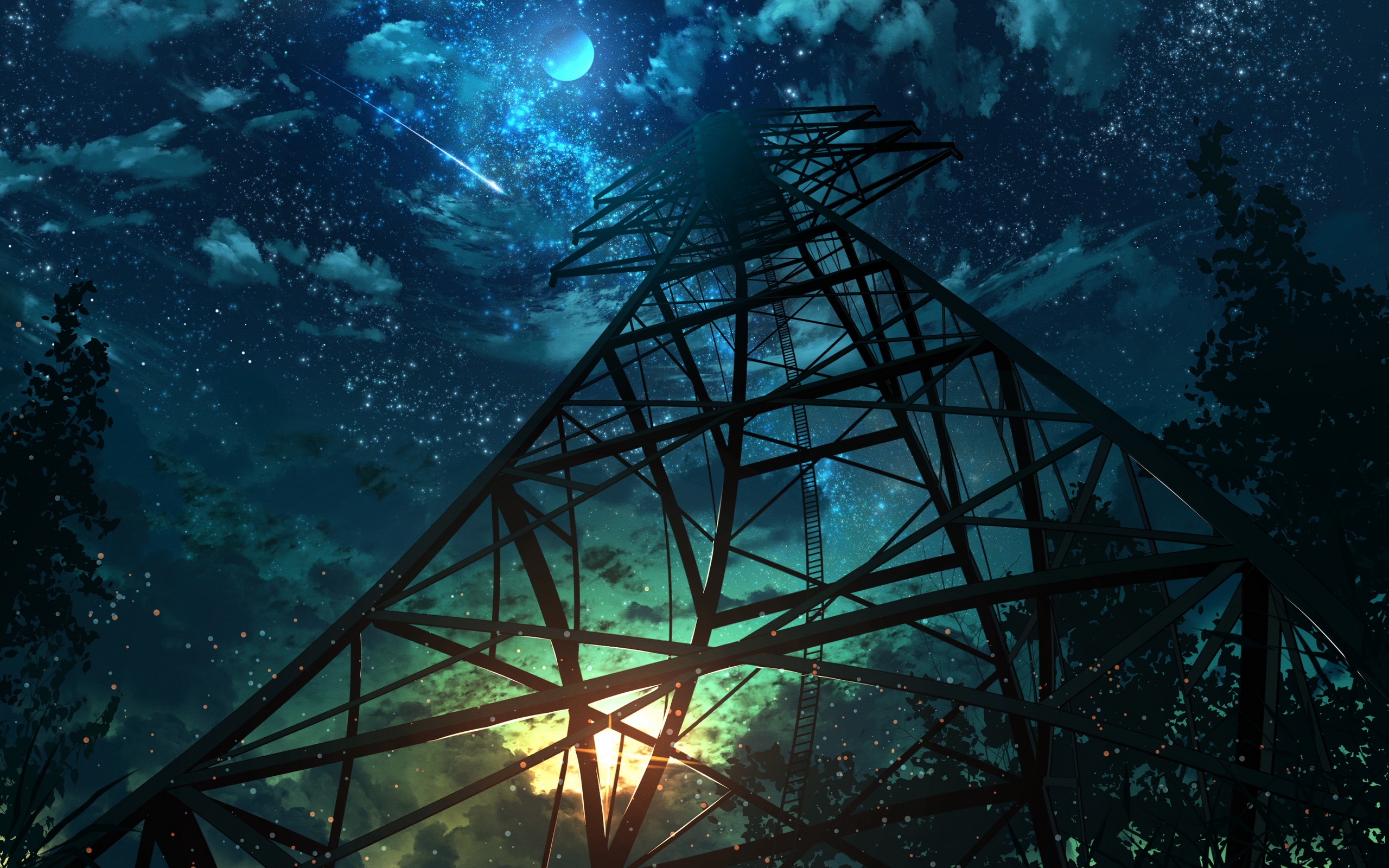 Description: A tower with a sky background and stars in the sky above it and a sun in the distance with a bright light shining on the top.