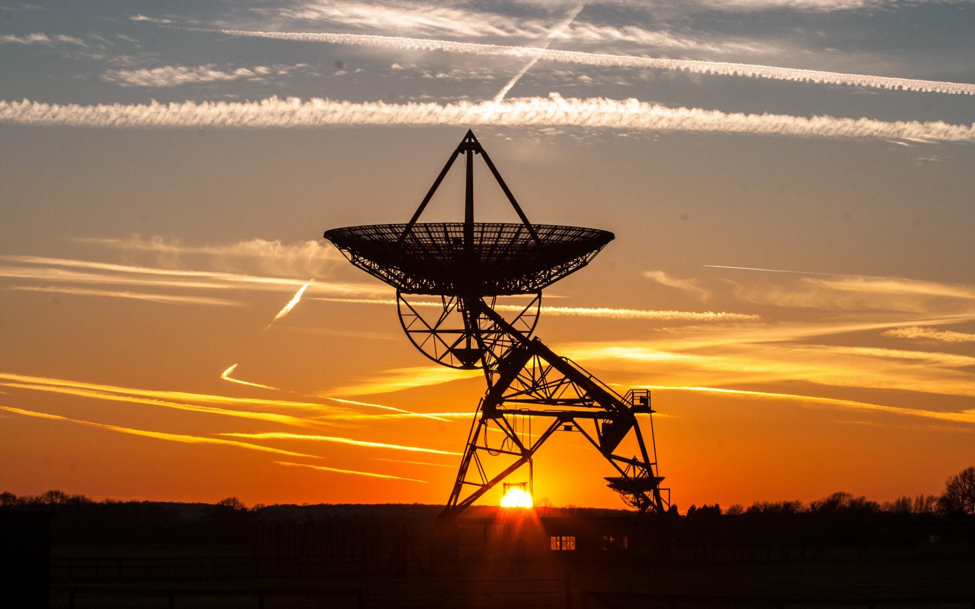 Description: A very tall tower with a very bright sun in the background and contrails in the sky above it.