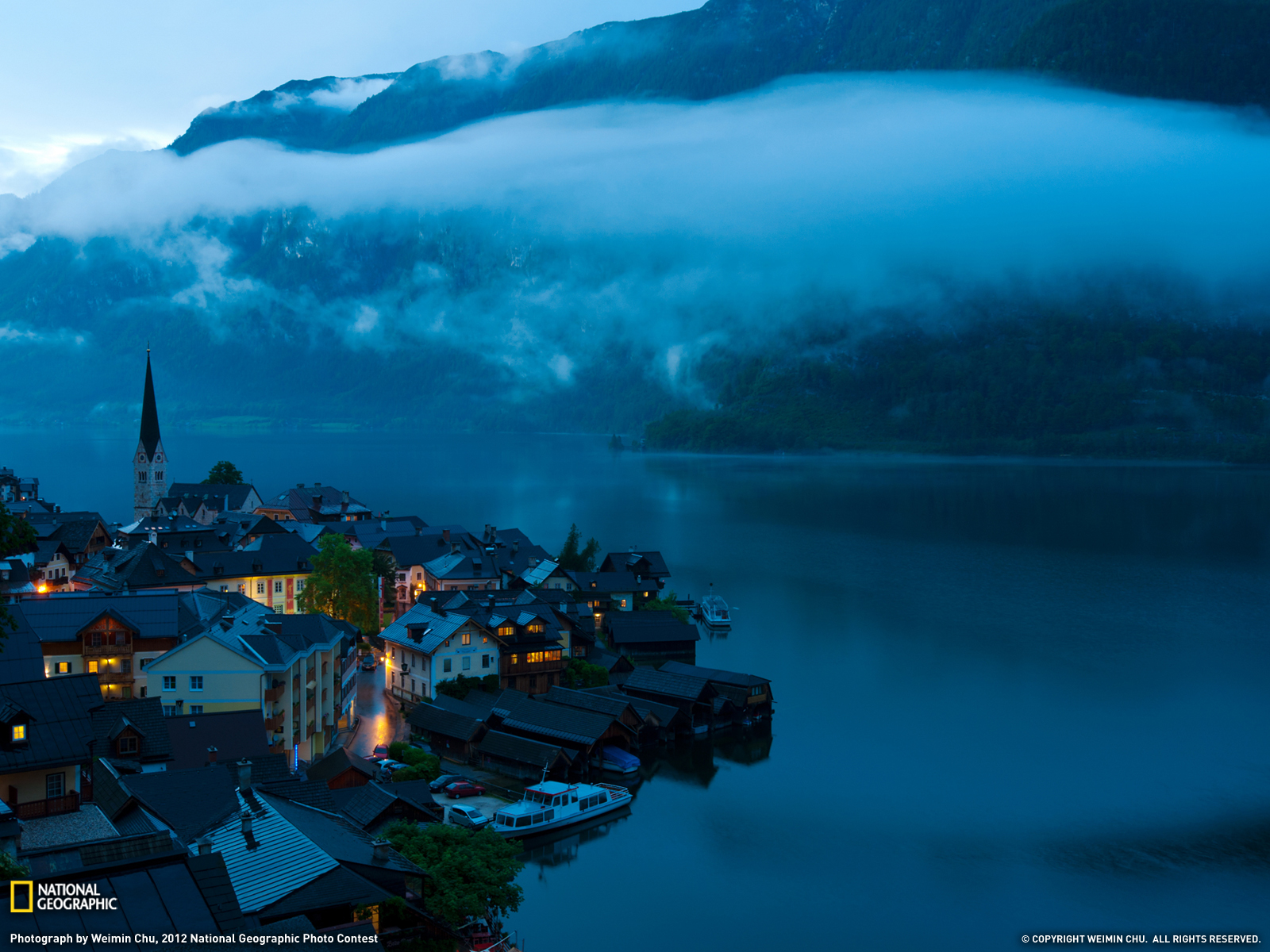 Description: A town with a mountain in the background and a body of water in the foreground with a fog hanging over the mountains.