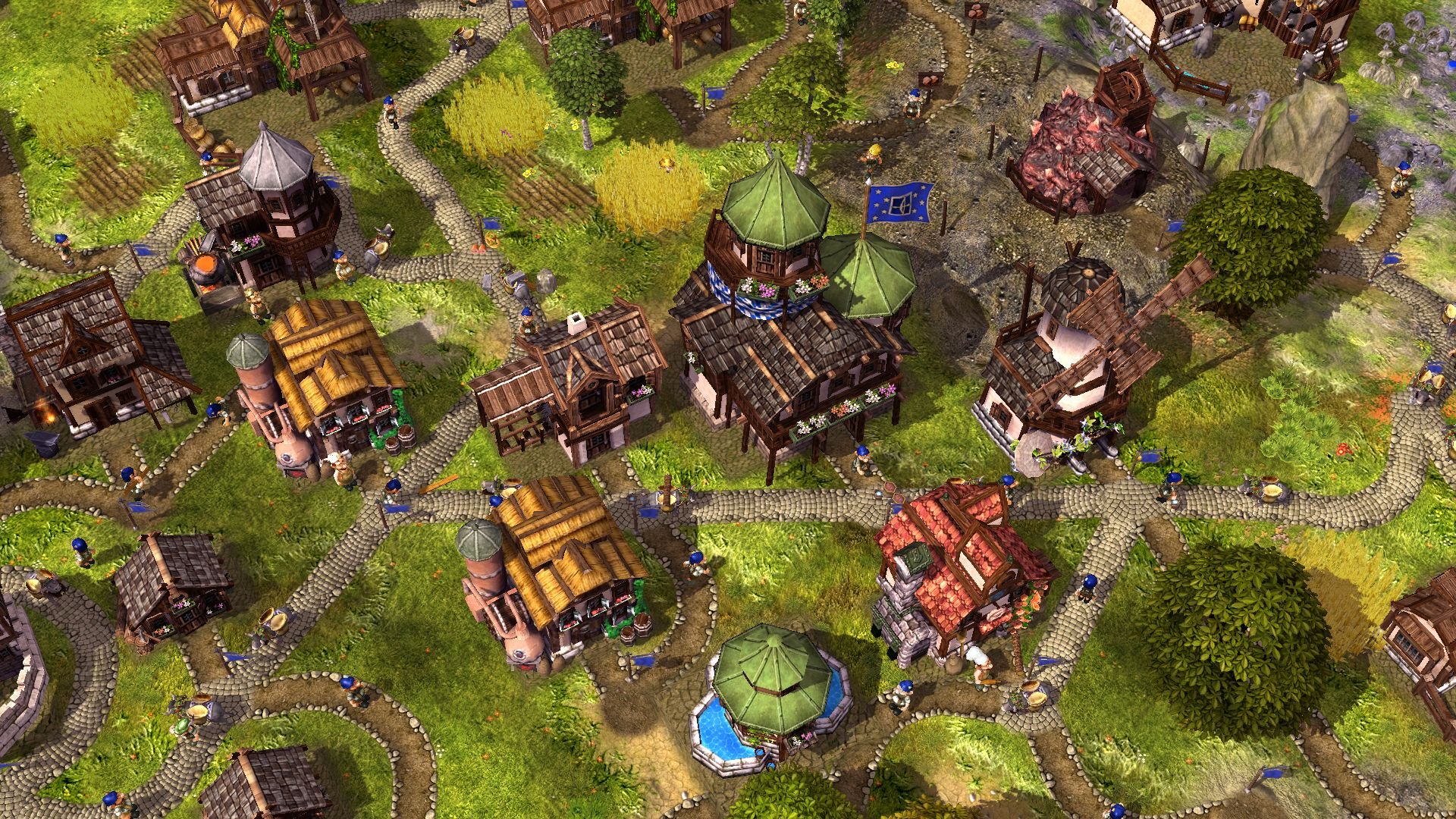 Description: A screenshot of a town with lots of trees and buildings in it.