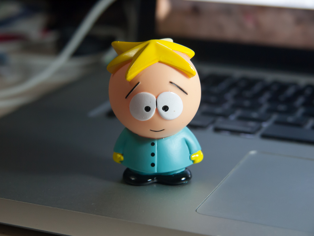 Description: A toy figure of a boy sitting in front of a laptop computer on a desk with a keyboard in the background.