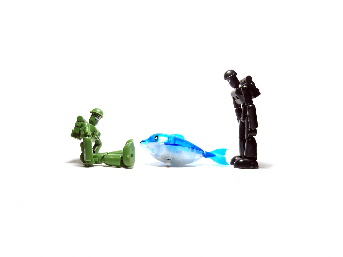 Description: A toy figure and a toy fish on a white background with a toy figure standing next to it and a toy figure holding a toy.