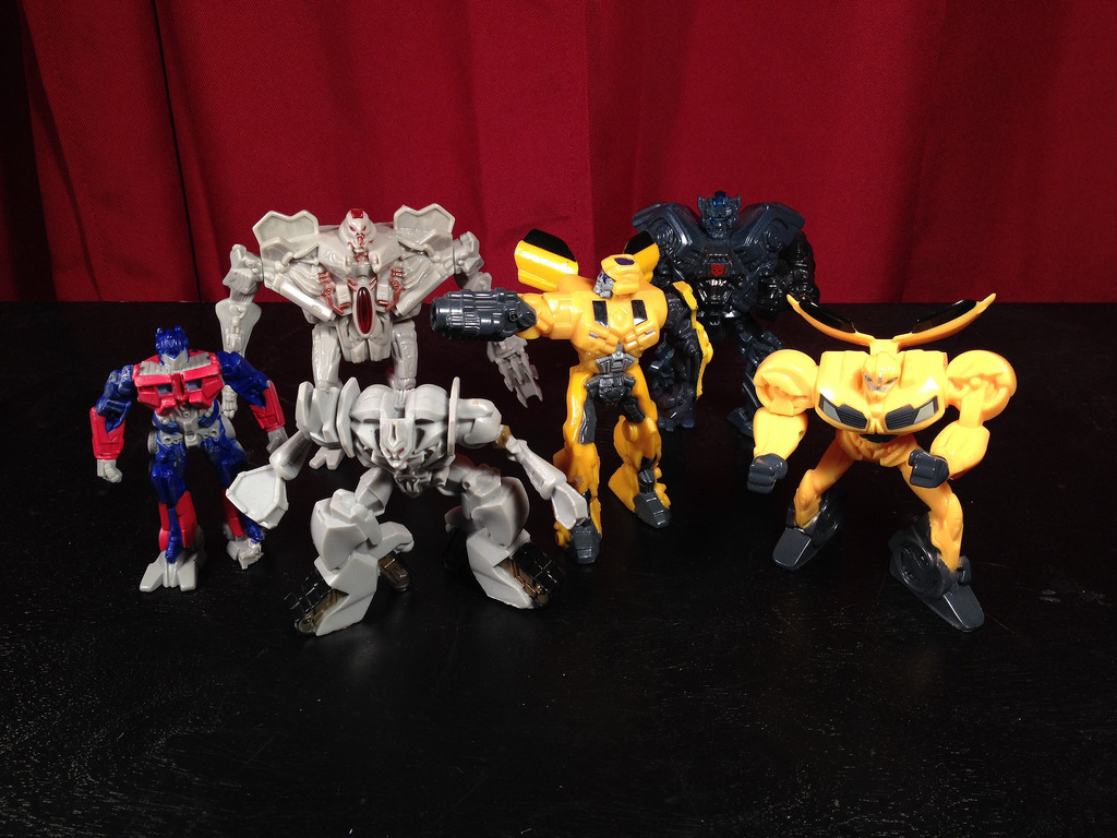 Description: A group of toy figures sitting on top of a table next to a red curtain and a black table.