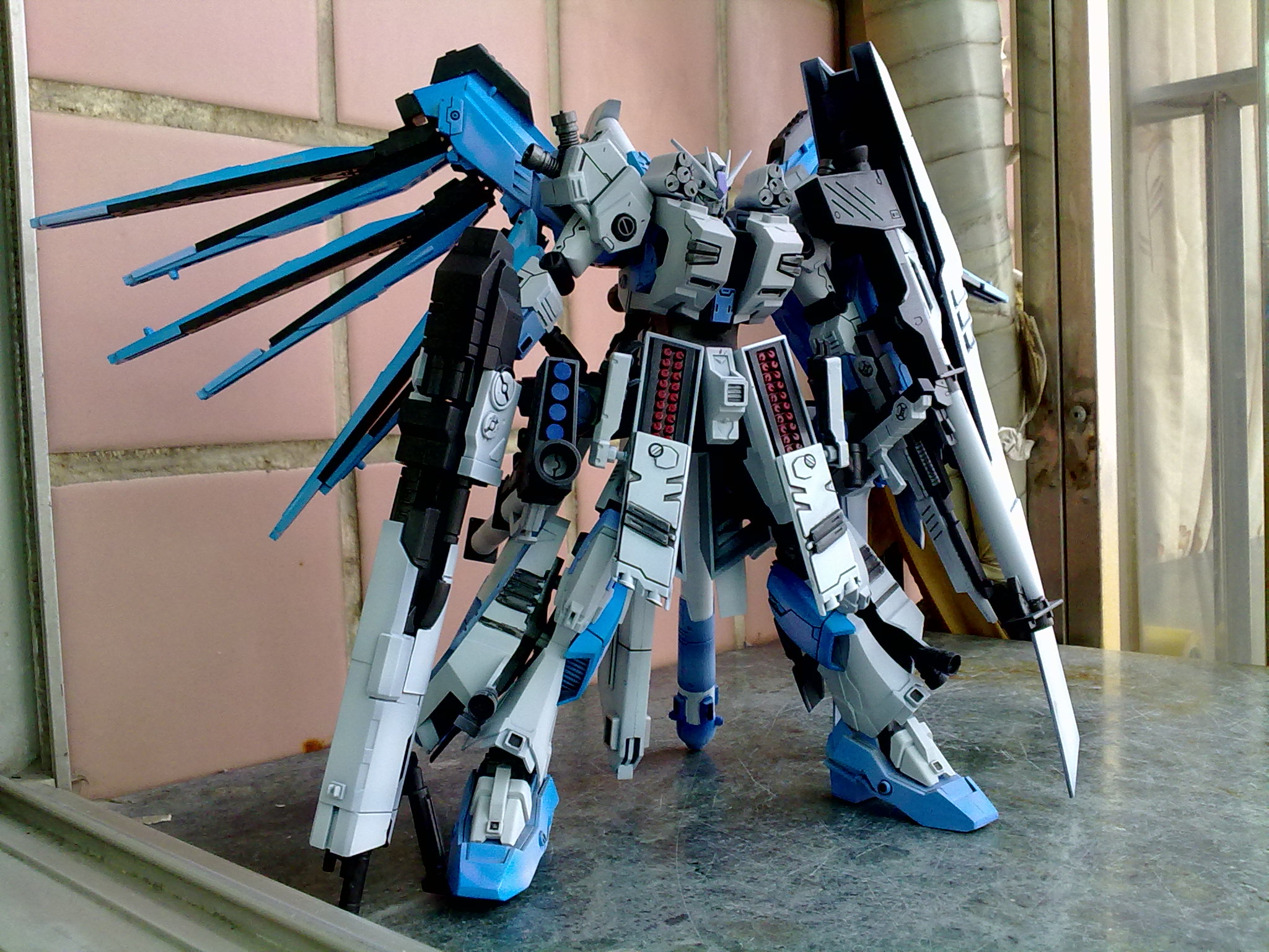 Description: A toy robot with a sword on a counter top next to a window frame with a pink wall behind it.
