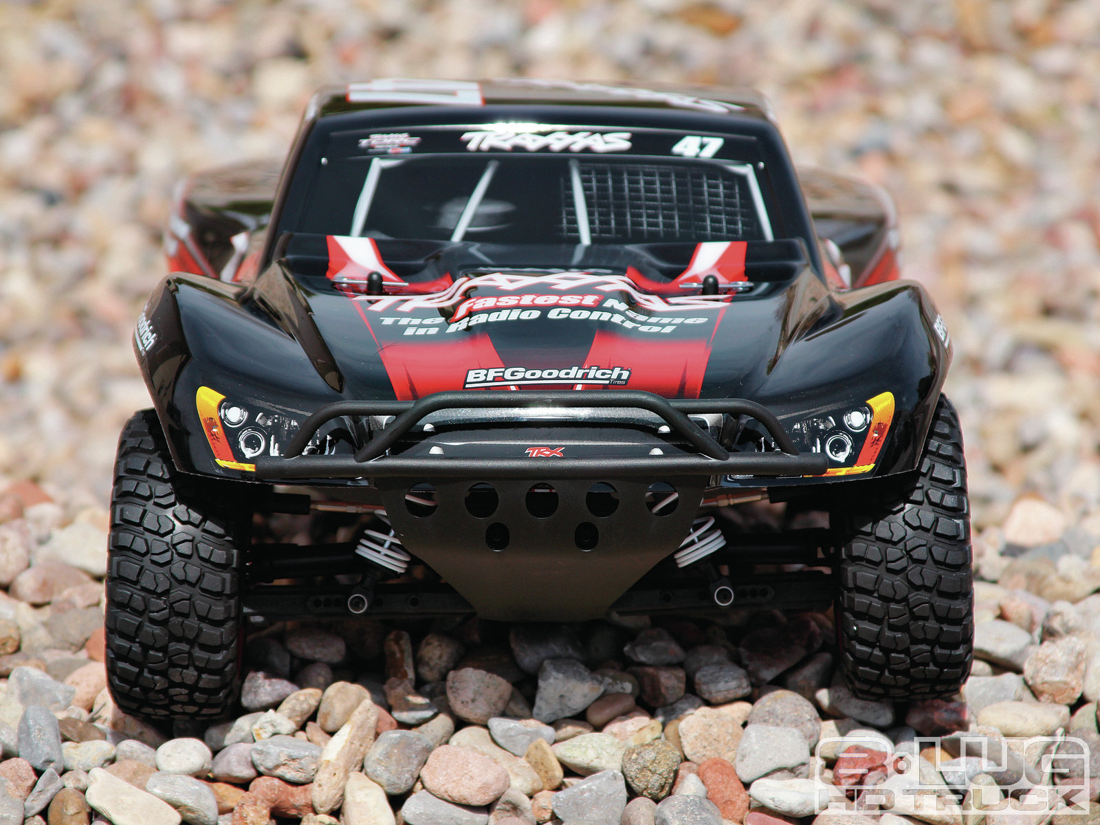 Description: A toy truck is on a rocky surface with rocks and gravel around it.