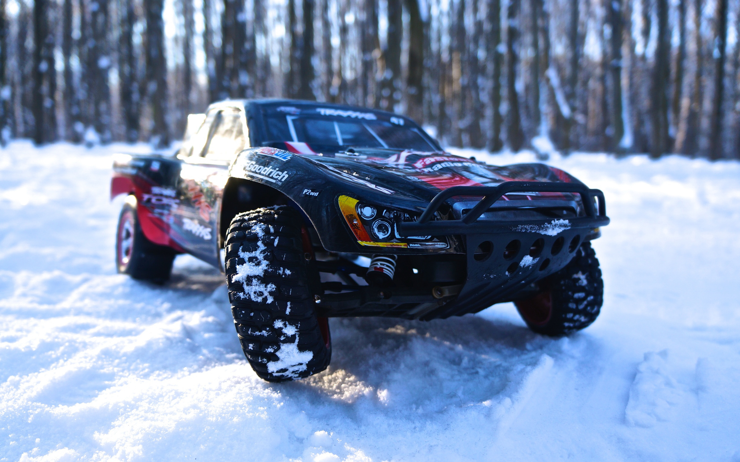 Description: A toy truck is driving through the snow in the woods on a sunny day with trees in the background.