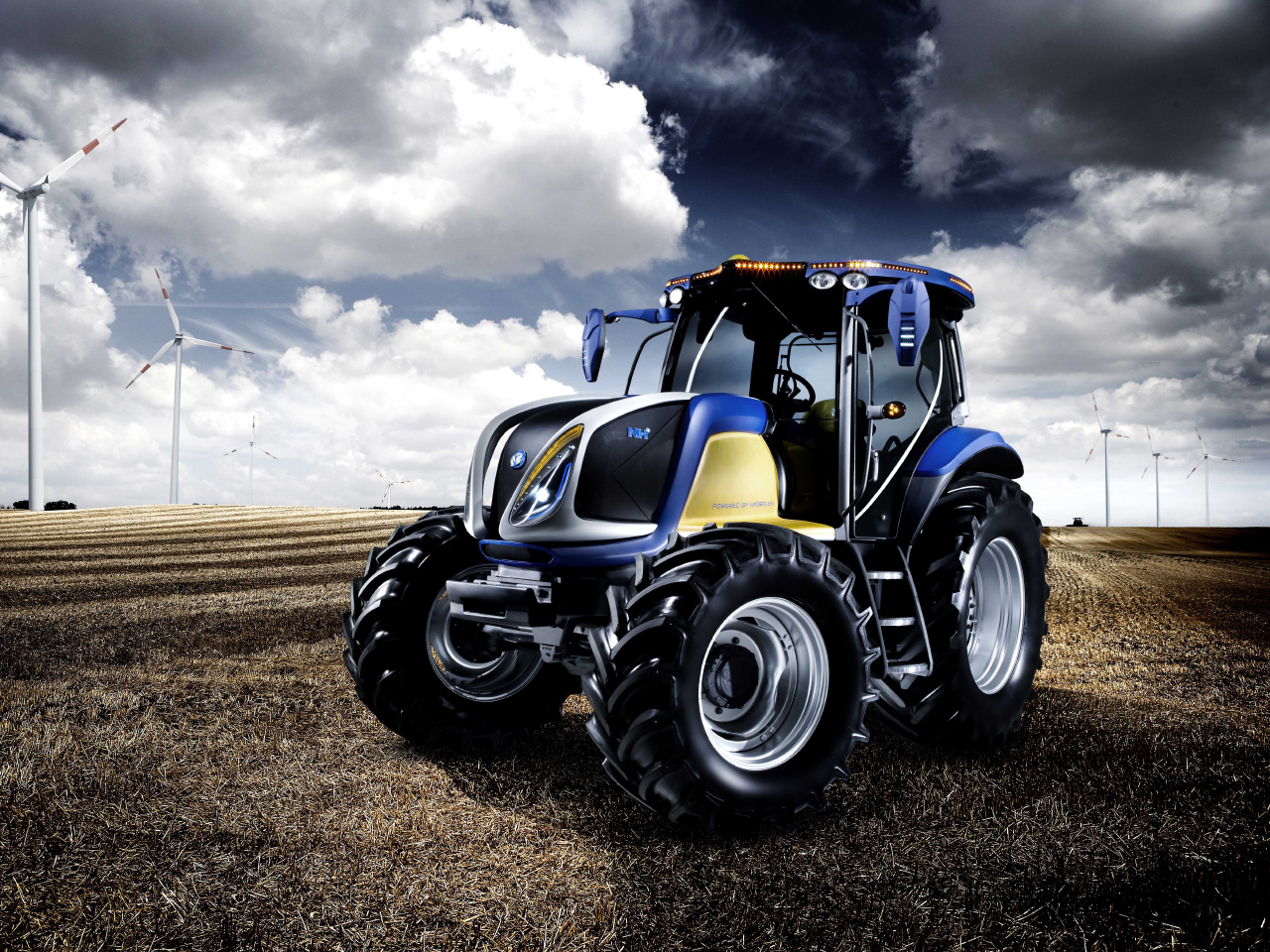 Description: A tractor is parked in a field with wind mills in the background and clouds in the sky above it.
