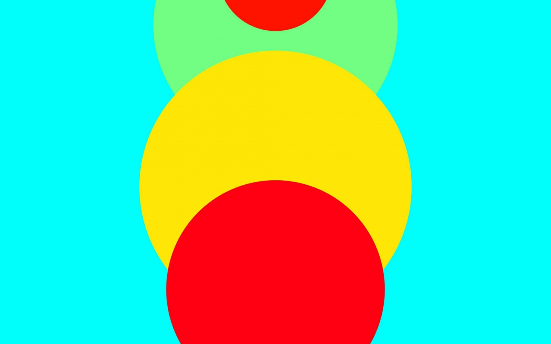 Description: A traffic light with a red and yellow light on it's side and a blue background with a red circle.