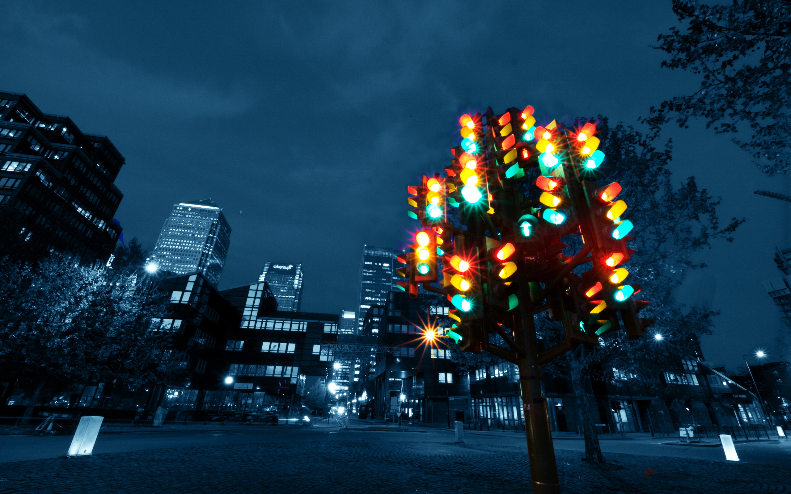 Description: A traffic light tree in a city park at night time with buildings in the background and a dark sky.