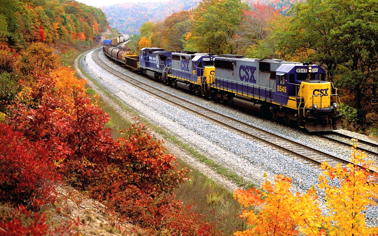 Description: A train traveling down tracks through a forest filled with trees and leaves in autumn colors.