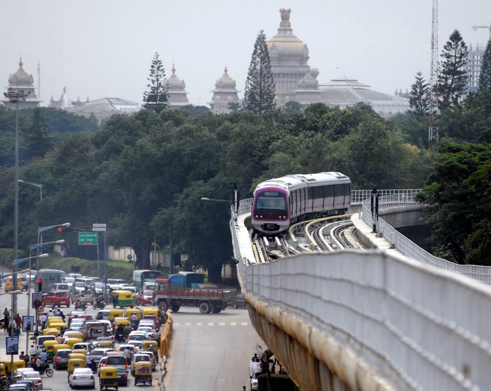 Description: A train is coming down the tracks in a busy city street with traffic on both sides of the tracks.