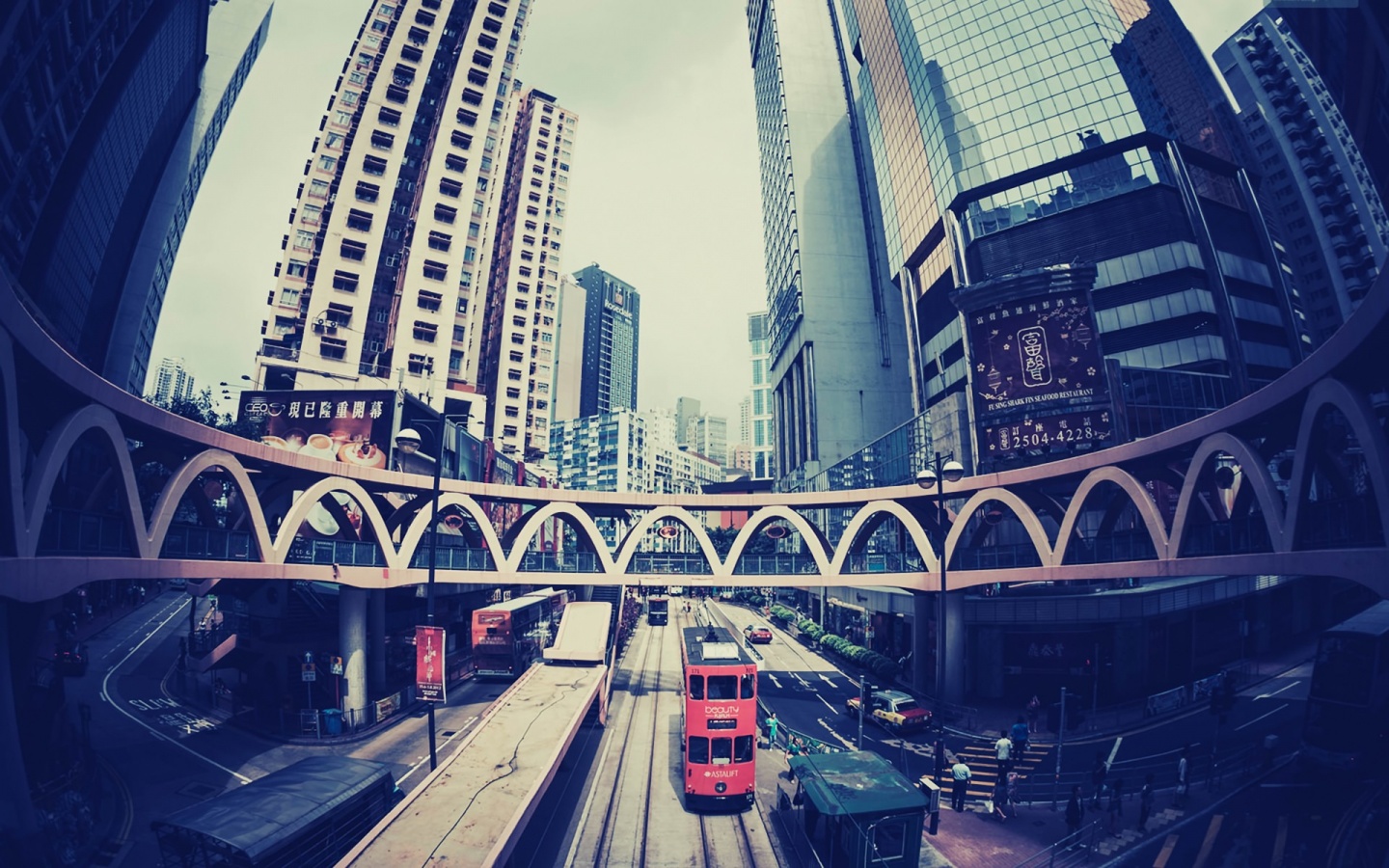 Description: A train traveling through a city next to tall buildings and a bridge over a river with a train on it.