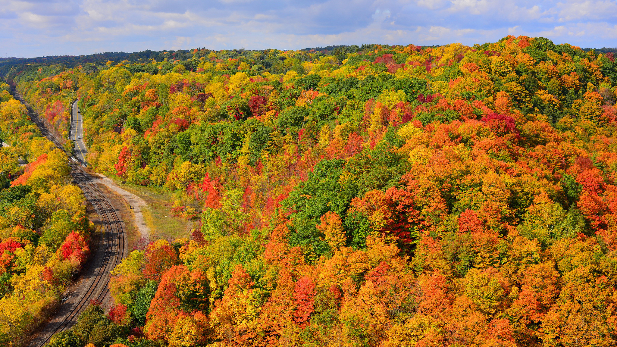 Description: A train traveling through a forest covered in trees in autumn colors.