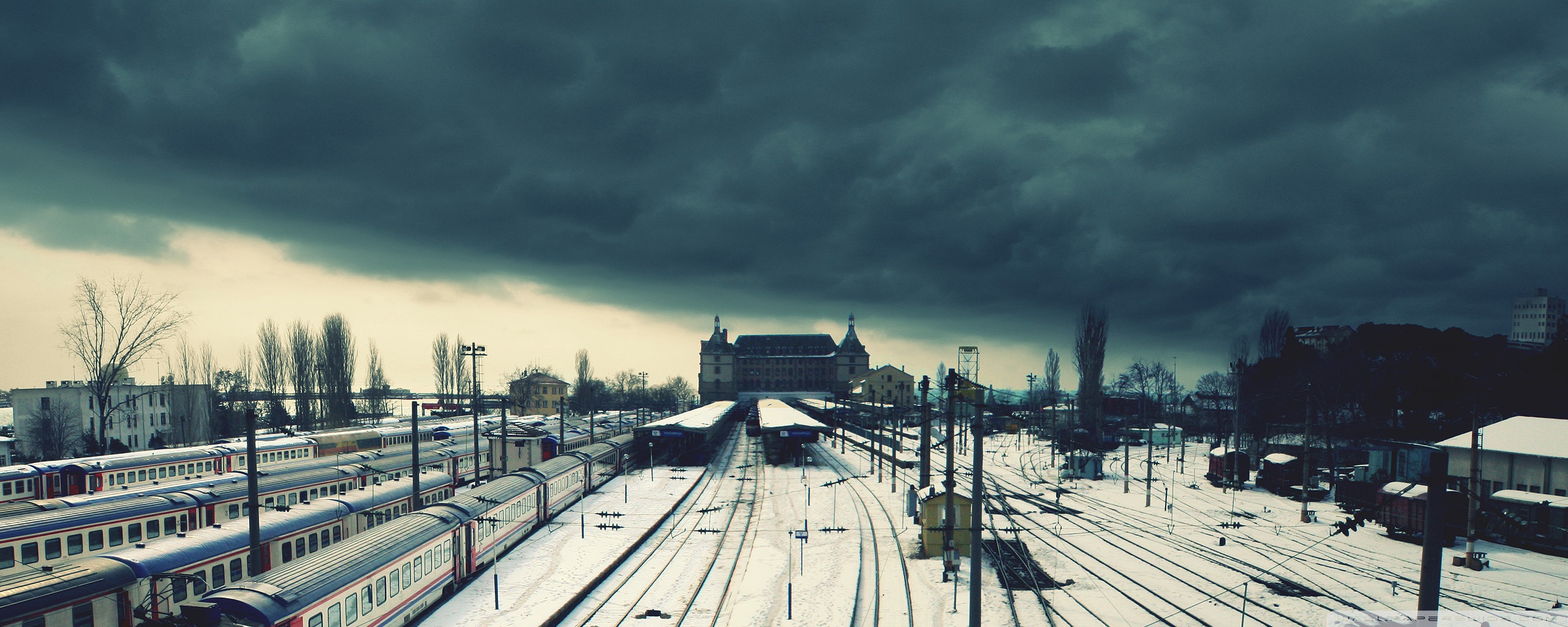 Description: A train station with a train on the tracks and a dark sky in the background with dark clouds above.