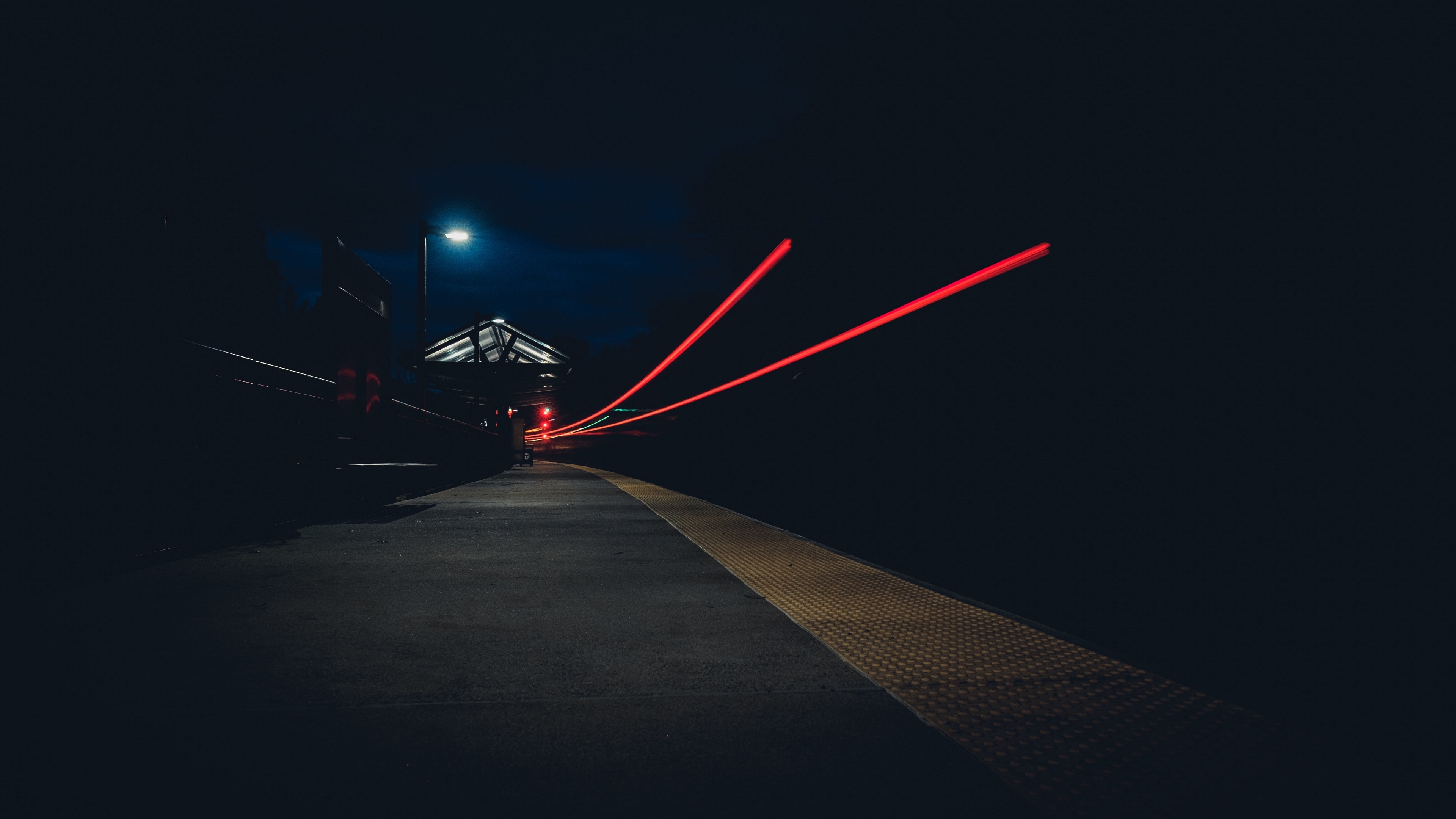 Description: A train station with a train on the tracks at night time with red lights coming from the platform and a building in the background.
