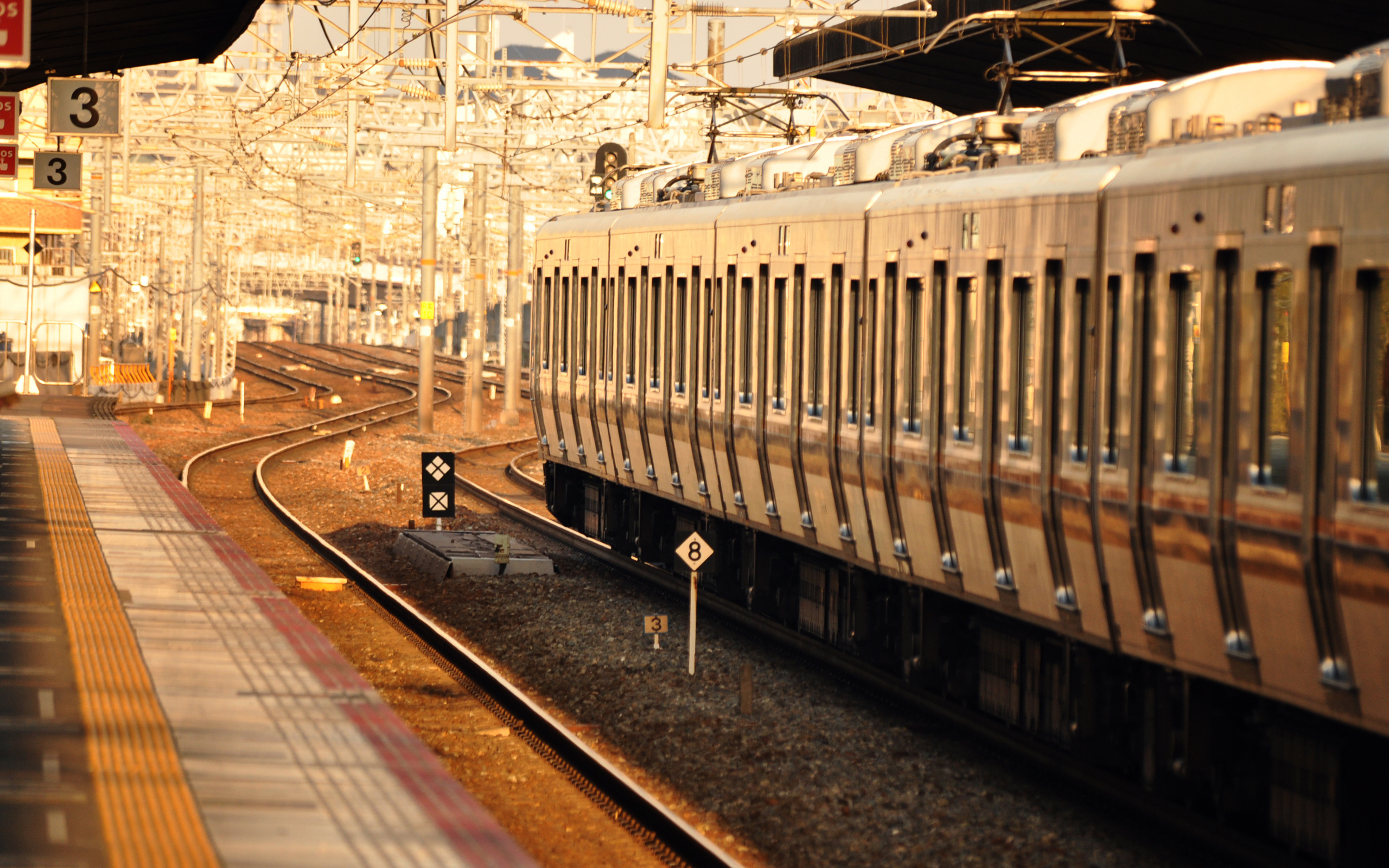 Description: A train is stopped at a train station with a sign on the platform that says no stopping on the train.