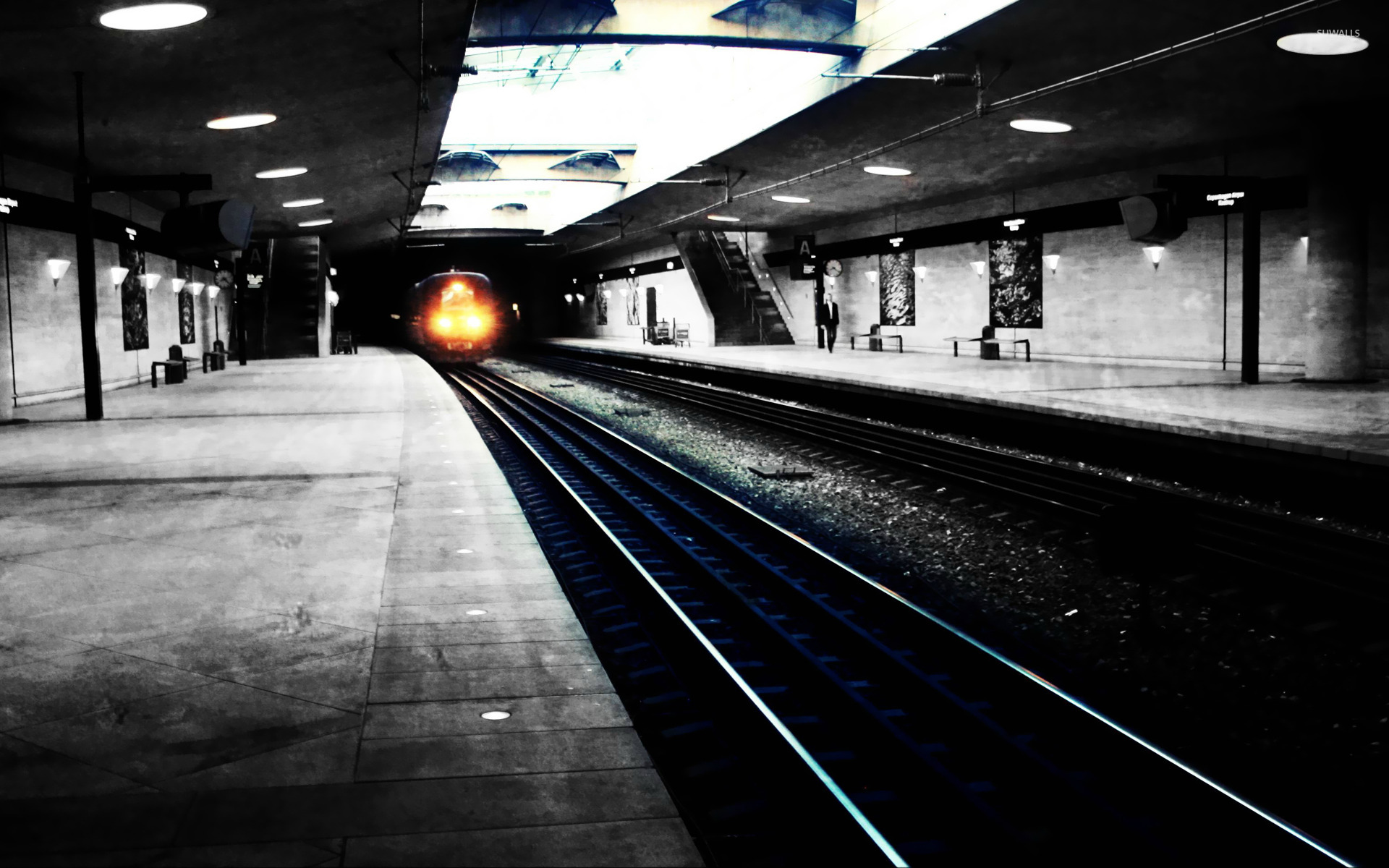 Description: A train station with a train on the tracks and a person walking on the platform in the distance.