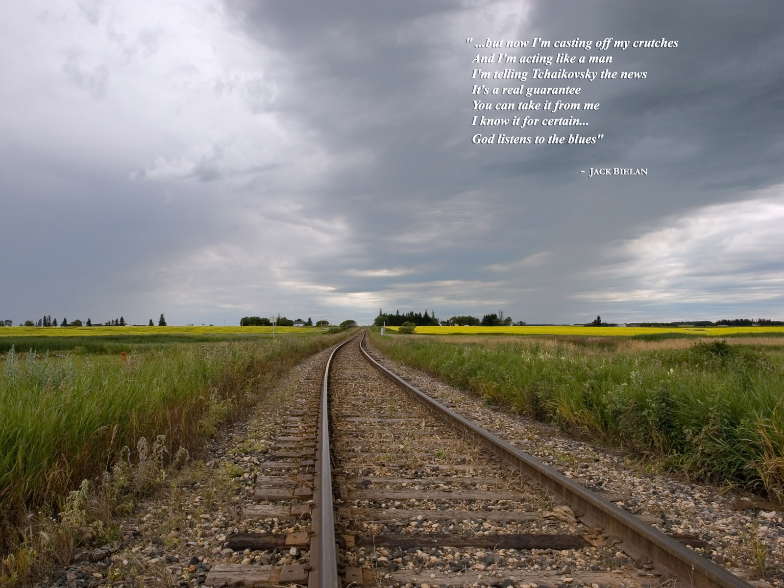 Description: A train track with a quote on it in the middle of a field with a sky background and a field of grass.
