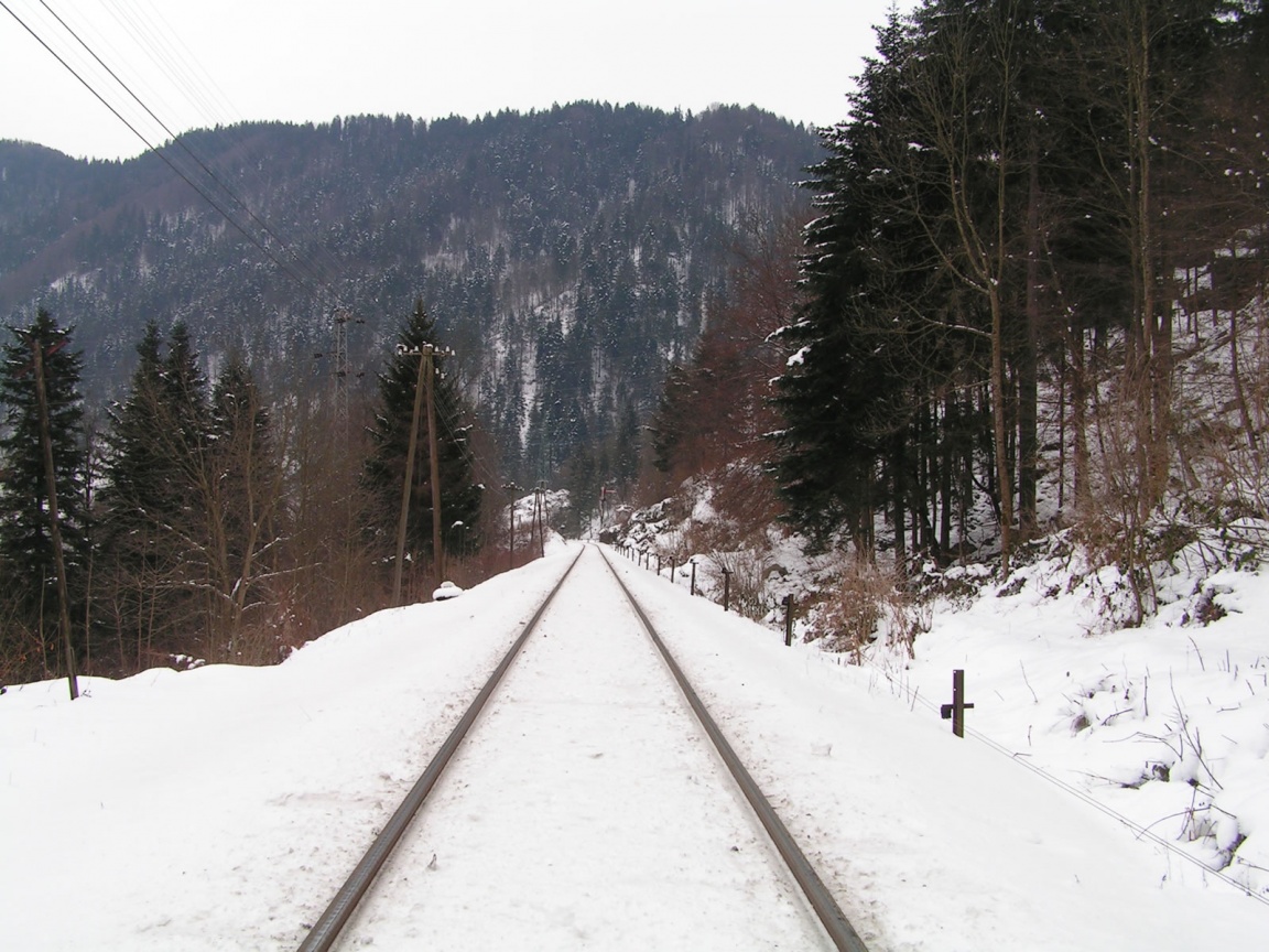 Description: A train track in the middle of a snowy forest area with a mountain in the background and power lines running along the side.