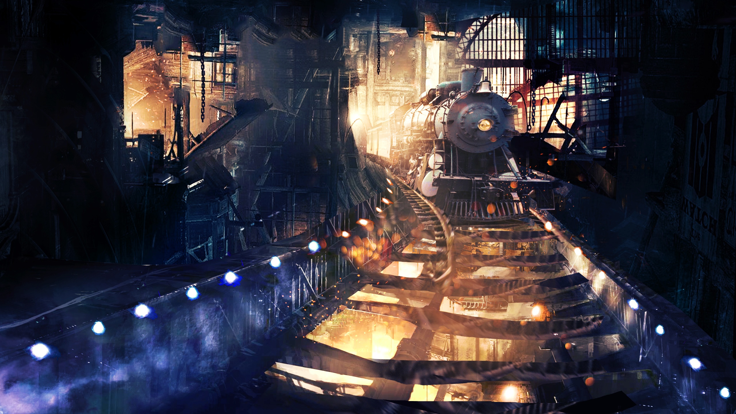 Description: A train traveling through a tunnel filled with lots of lights and a train engine on the tracks in the middle of the tunnel.