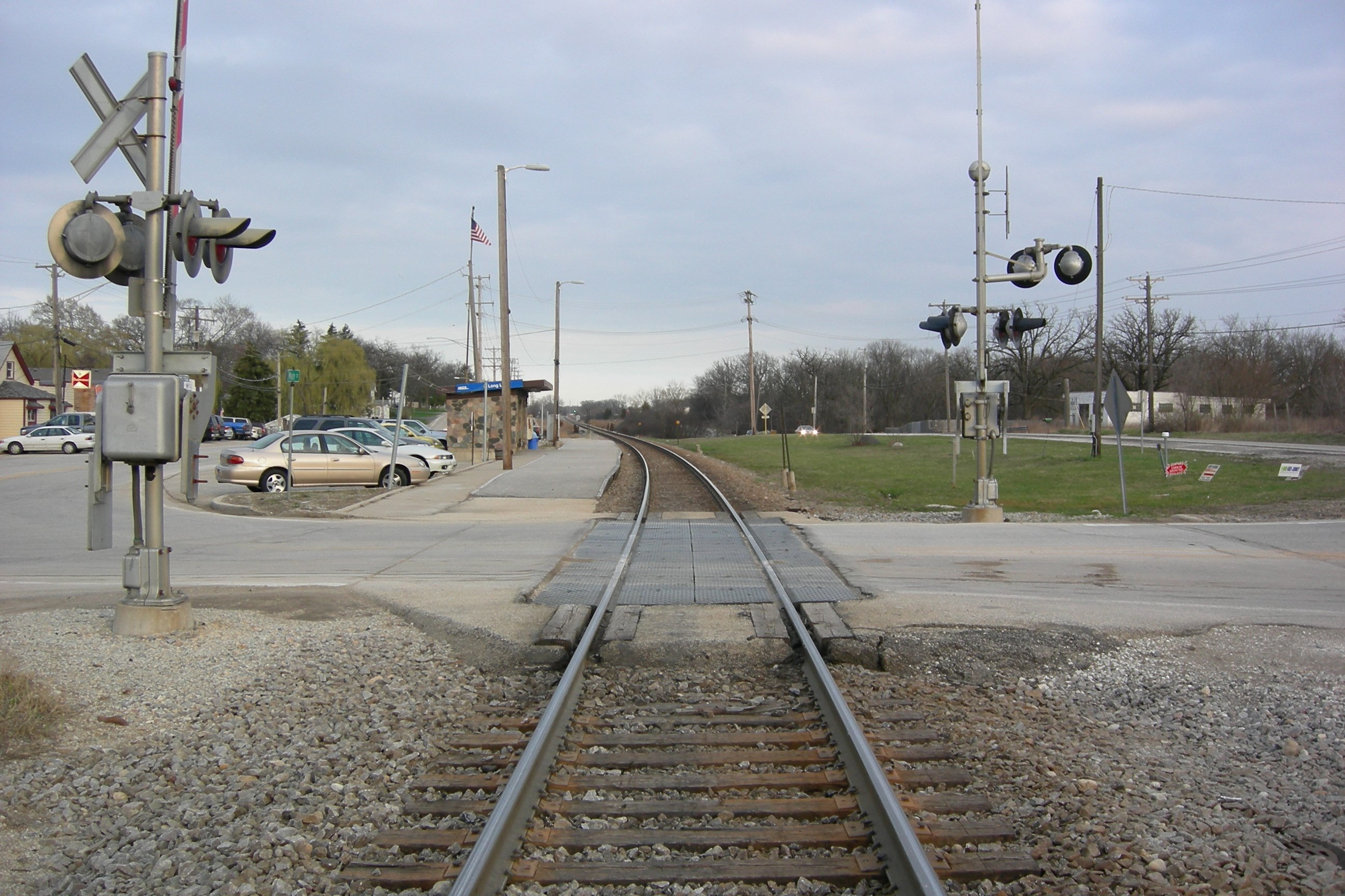 Description: A train track with a car on the other side of it and a stop light on the other side.