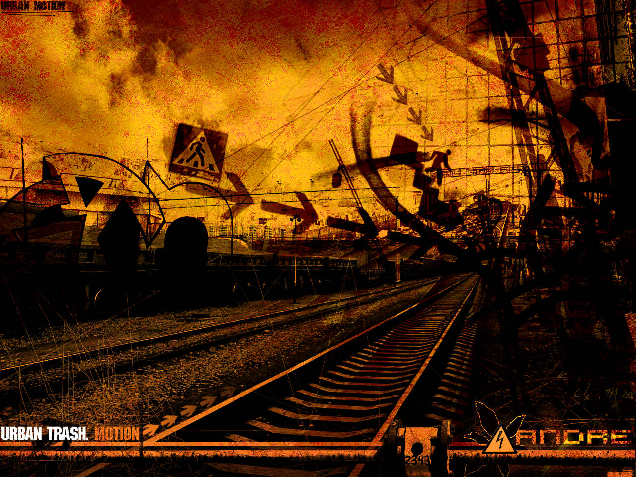 Description: A train track with a red sky in the background and a yellow sky in the foreground with a red and black background.