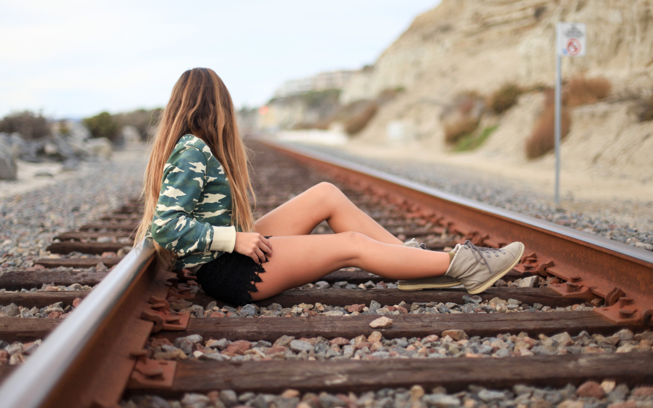 Description: A woman sitting on a train track with her legs crossed and her legs crossed out.